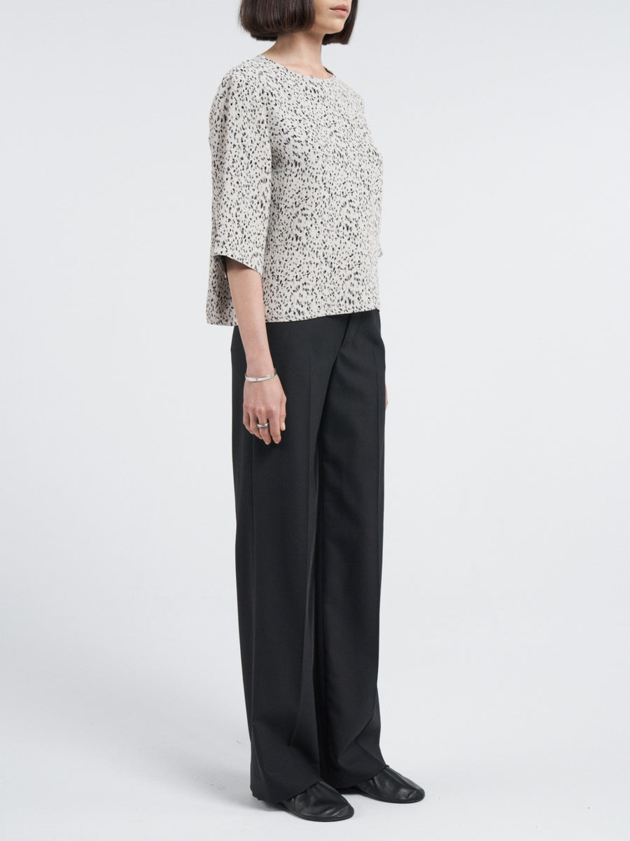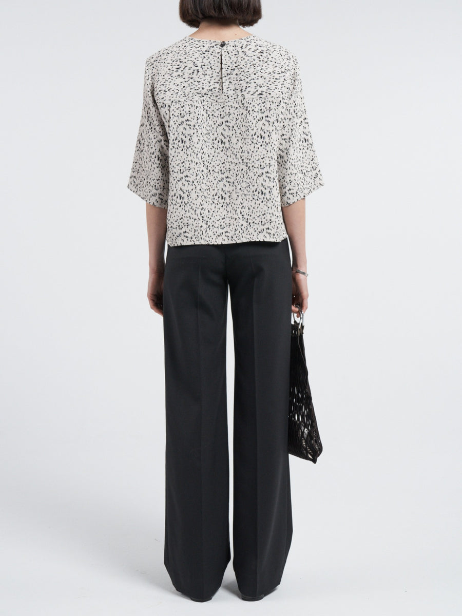 Crafted from Ivory pebble jacquard, this t-shirt features elbow-length sleeves and our signature cocoon-like silhouette, enhanced by two back box pleats. The keyhole back closure is fastened with a single Australian Trocas shell pearl shank button.