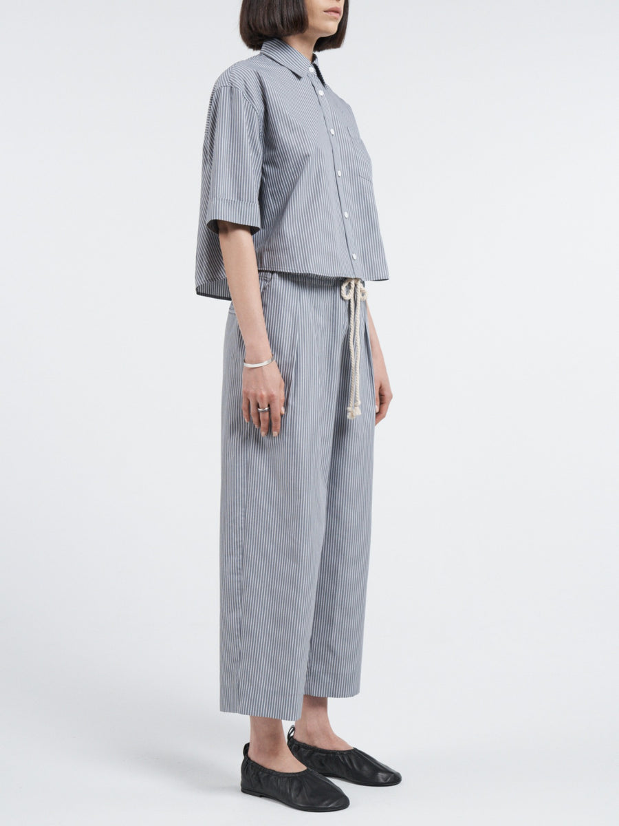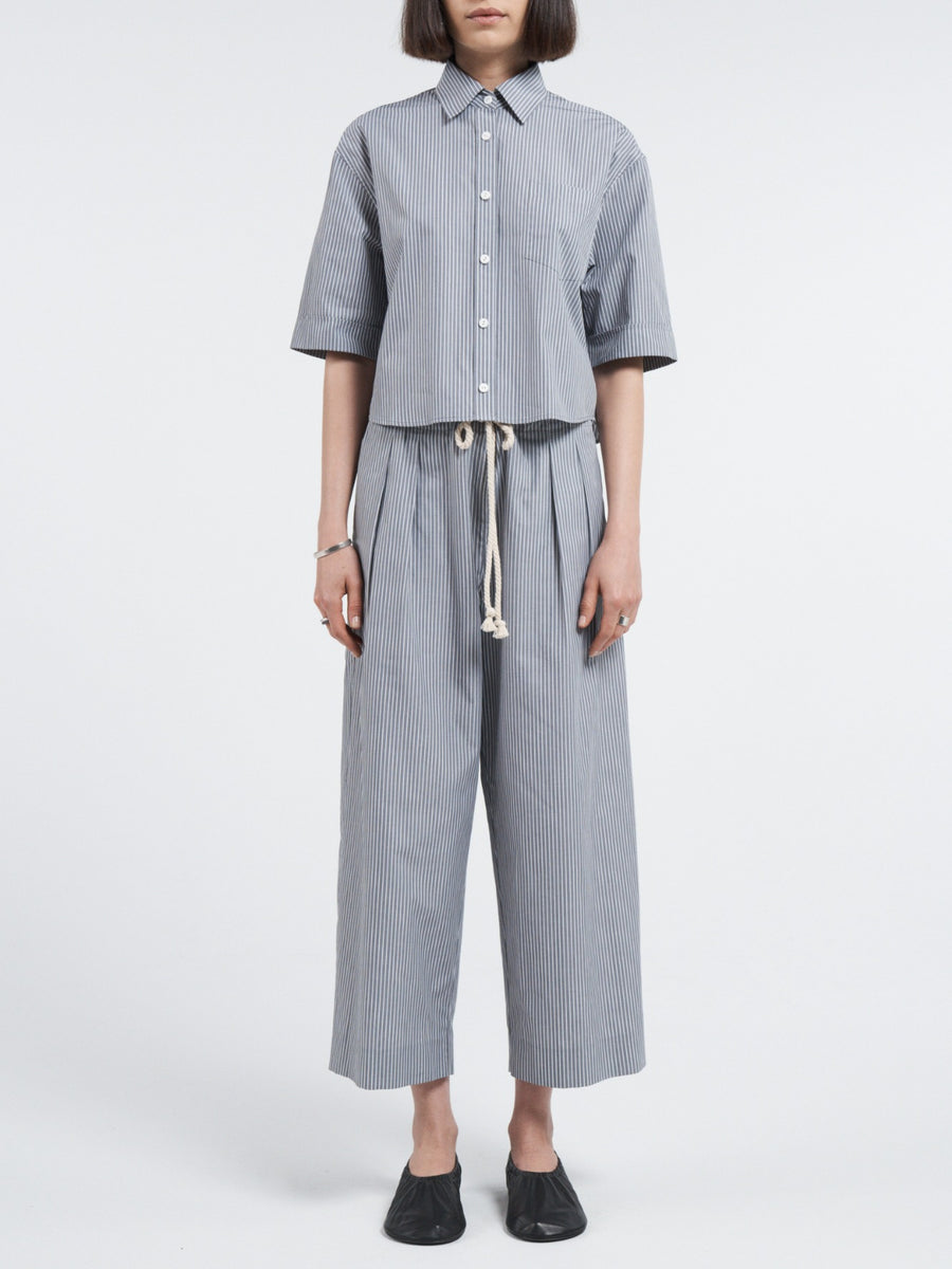 Crafted from organic cotton in a grey and white railroad stripe, this classic shirt features a straight crop and elbow length cuffed sleeves. Retaining the signature cocoon-like silhouette of our oversized shirt, this version is tailored to hit at the waist.