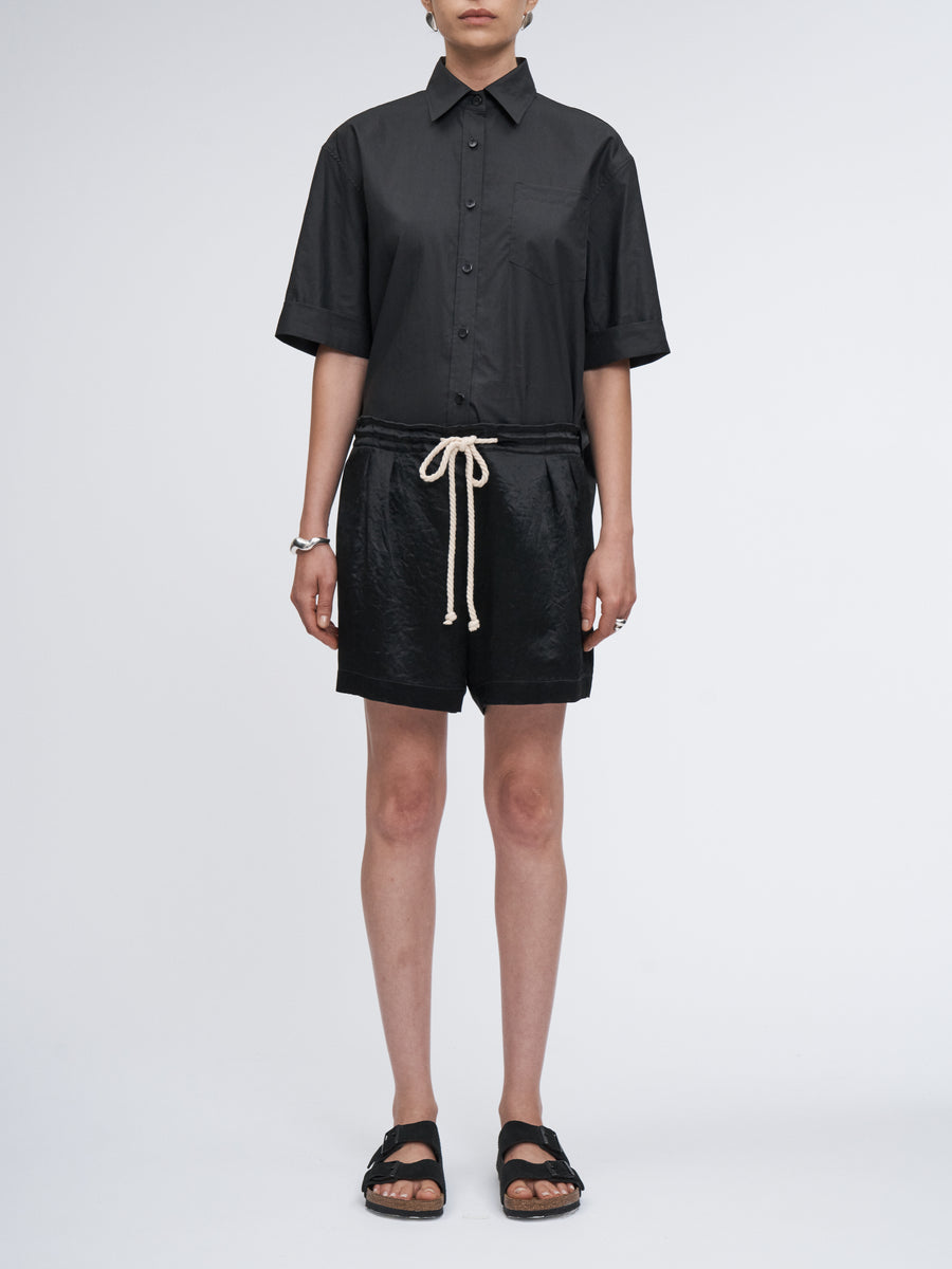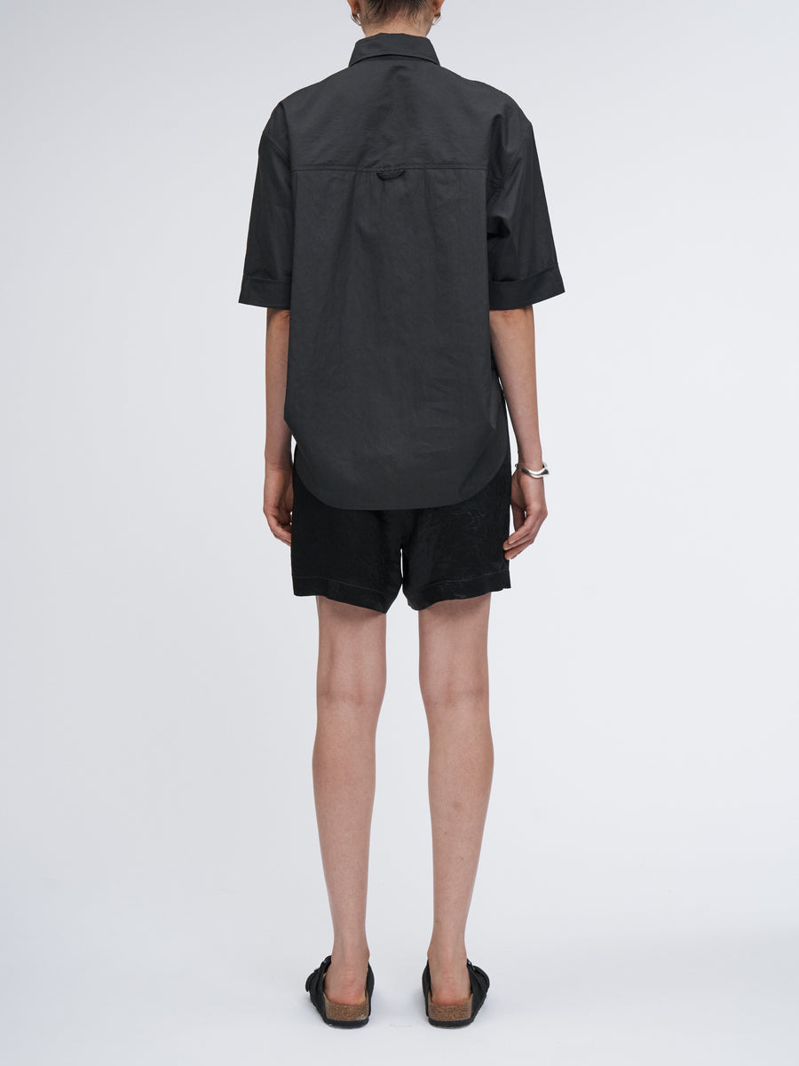 Crafted from organic Portuguese cotton sateen in a classic black, this menswear inspired oversized shirt is a wardrobe staple. With the same cocoon-like silhouette as our classic oversized shirt, this version is designed with elbow-length cuffed short sleeves, offering a relaxed, airy fit.
