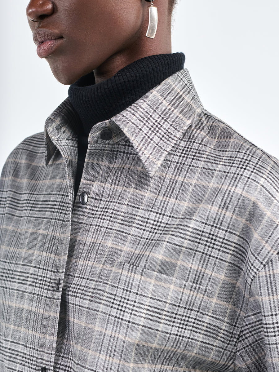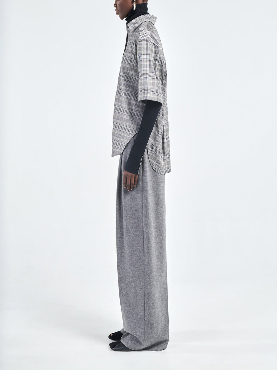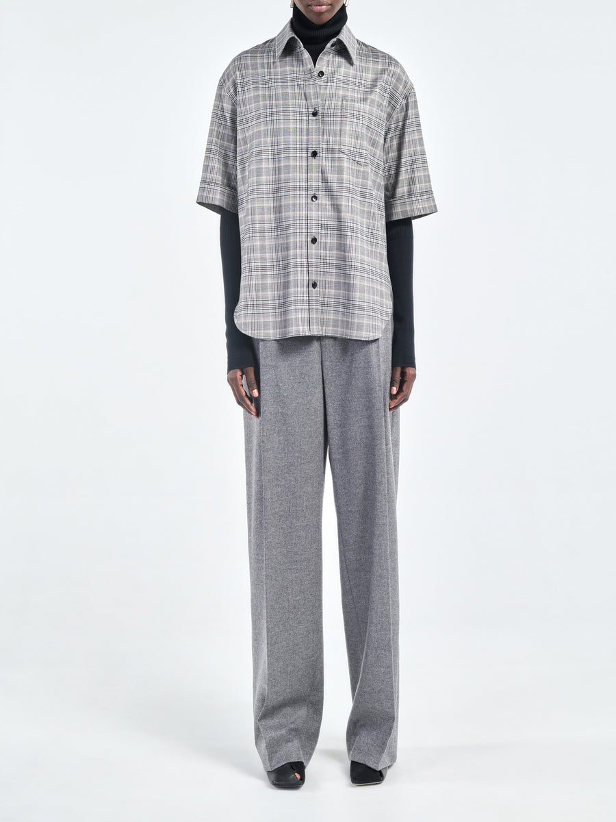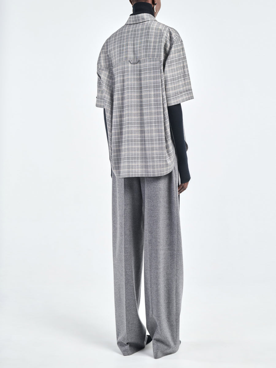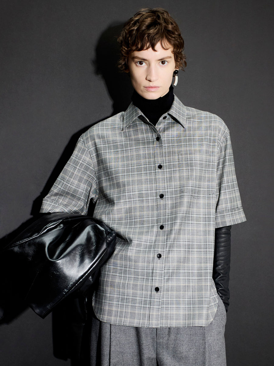 The Short Sleeve Oversized Shirt in grey plaid is made from Italian wool-viscose. It has our signature inverted box pleats for a gentle cocoon like silhouette at the back and double needle stitch details at the cuff, finished with our signature black corozo nut buttons. Depending on your height, it finishes at the low hip.