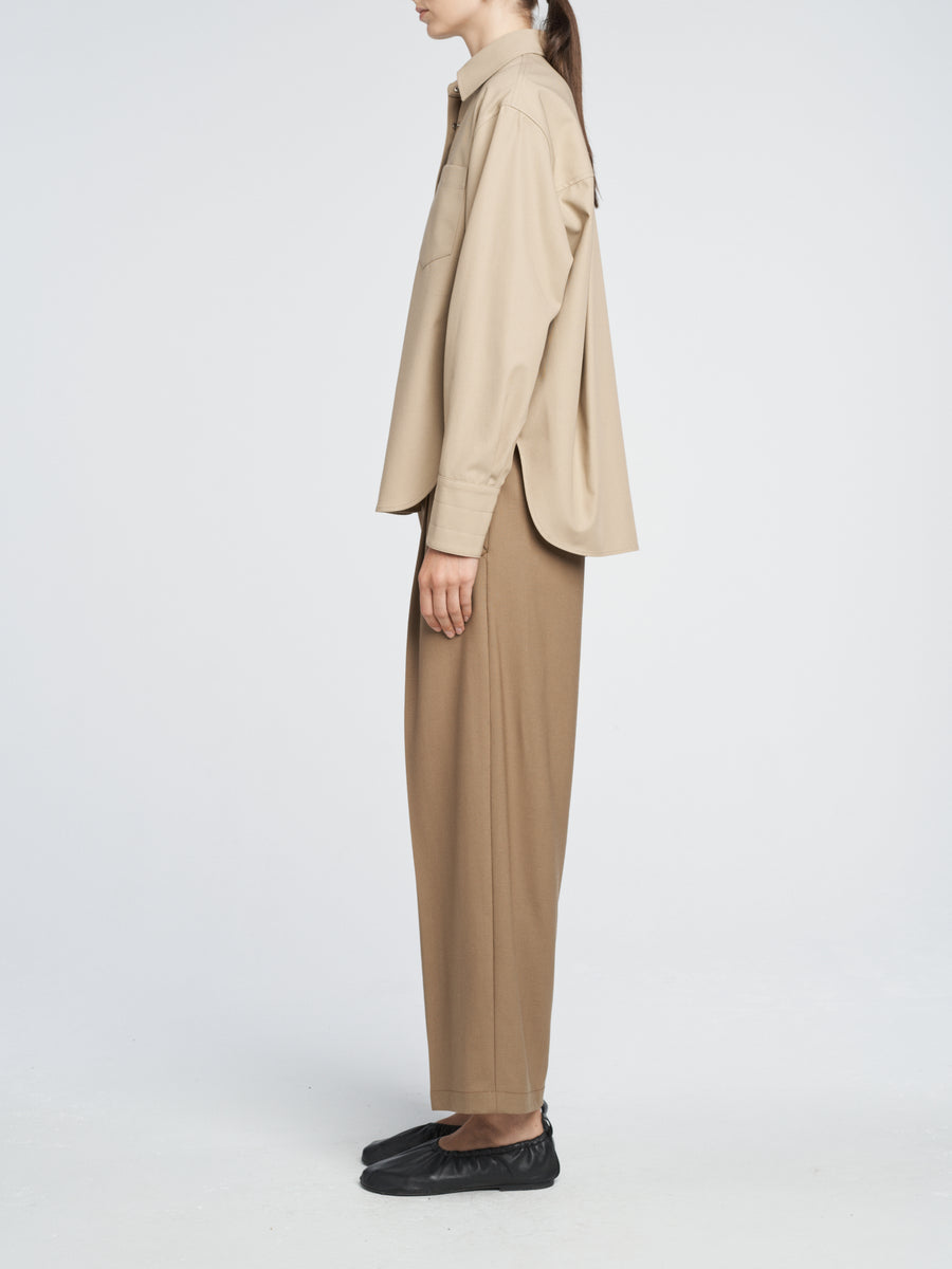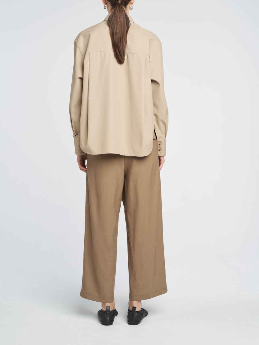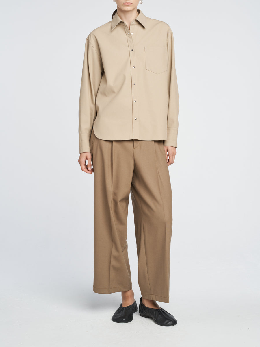 A similar silhouette to our best selling tunic shirt, the Snap Shirt made of a 100% organic high twist cotton features back box pleats for a cocoon-like effect, our signature U-shaped curved side hem and is finished with silver snap closures.