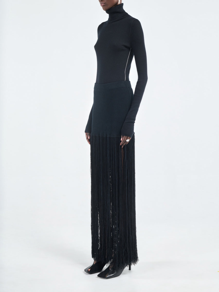 Black ribbed turtleneck in Italian responsible fine merino wool. Slim fitting with a soft, lightweight feel. Designed for layering or wearing alone.