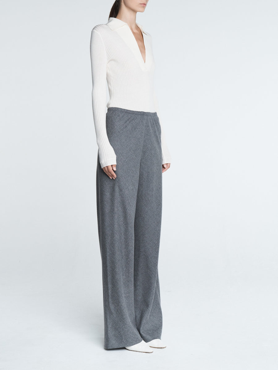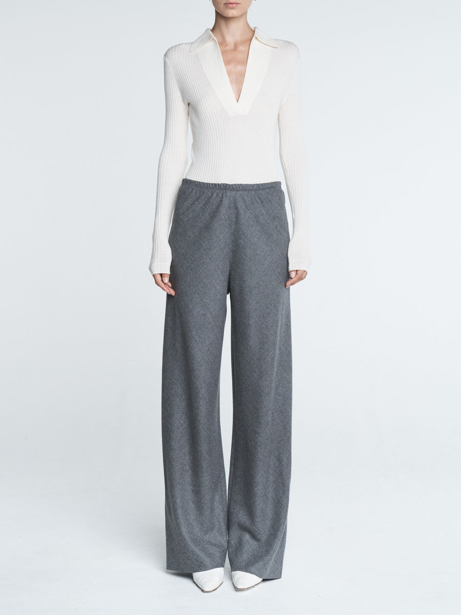 Ivory Single Button Polo in Italian responsible merino wool. Features a deep v-neck with collar with a single button closure that can be buttoned or left open. It is slim fitting and meant to be worn close to the body.