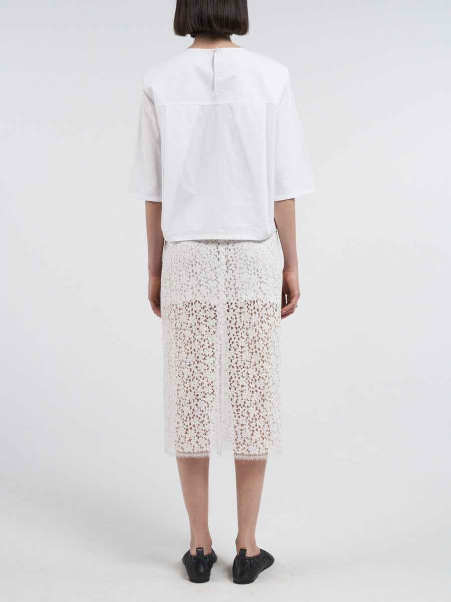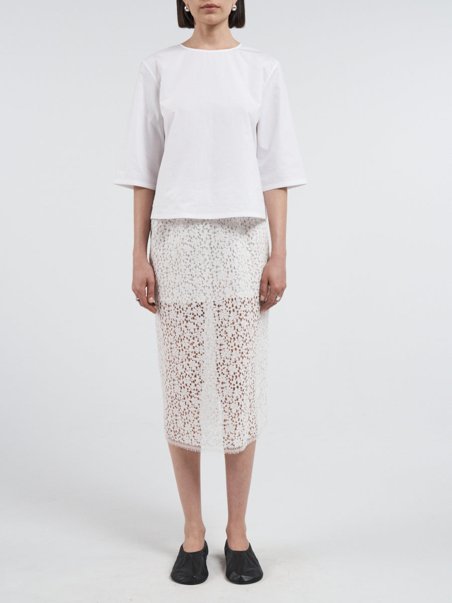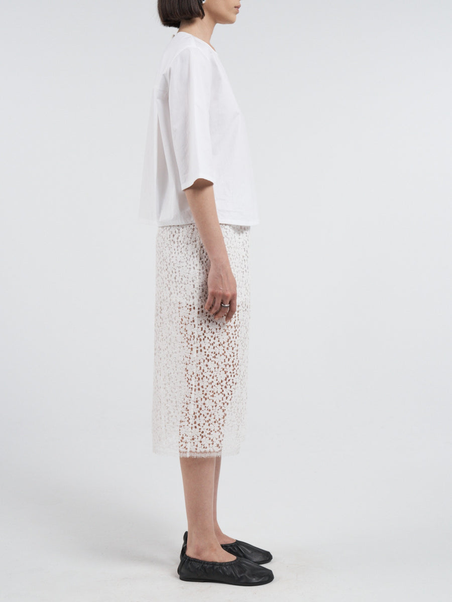 The lace ruched skirt is defined by an elasticated waistband, enhanced with ruched Naia™ ivory matte twill. Its straight silhouette, crafted from Dentelle de Calais-Caudry® white lace, falls just below the knee, beautifully finished with intricate eyelash detailing along the hem.
