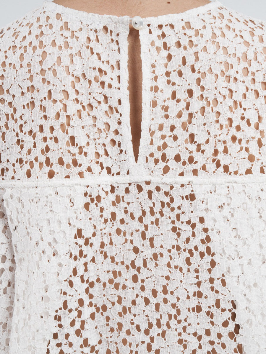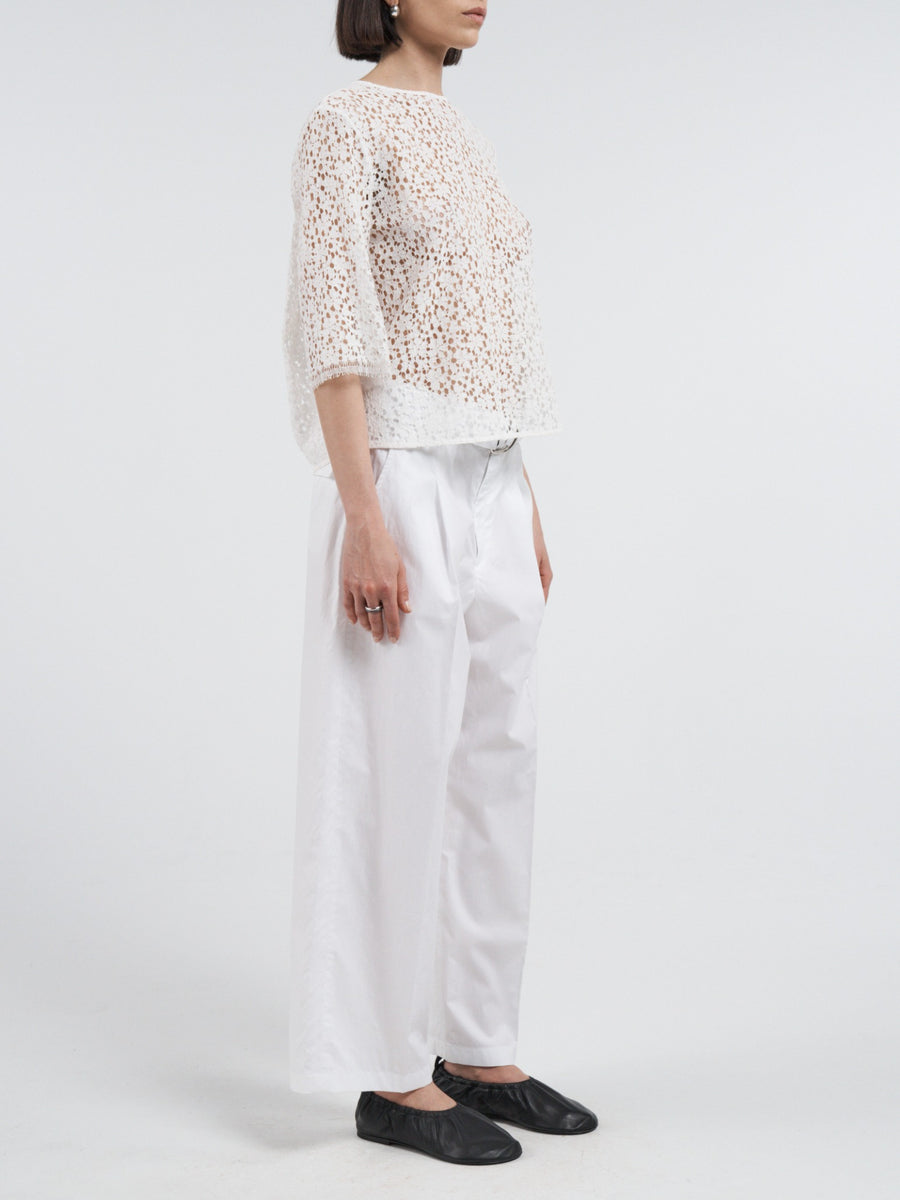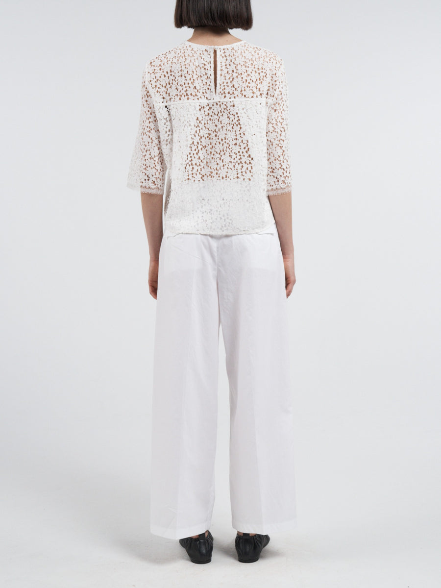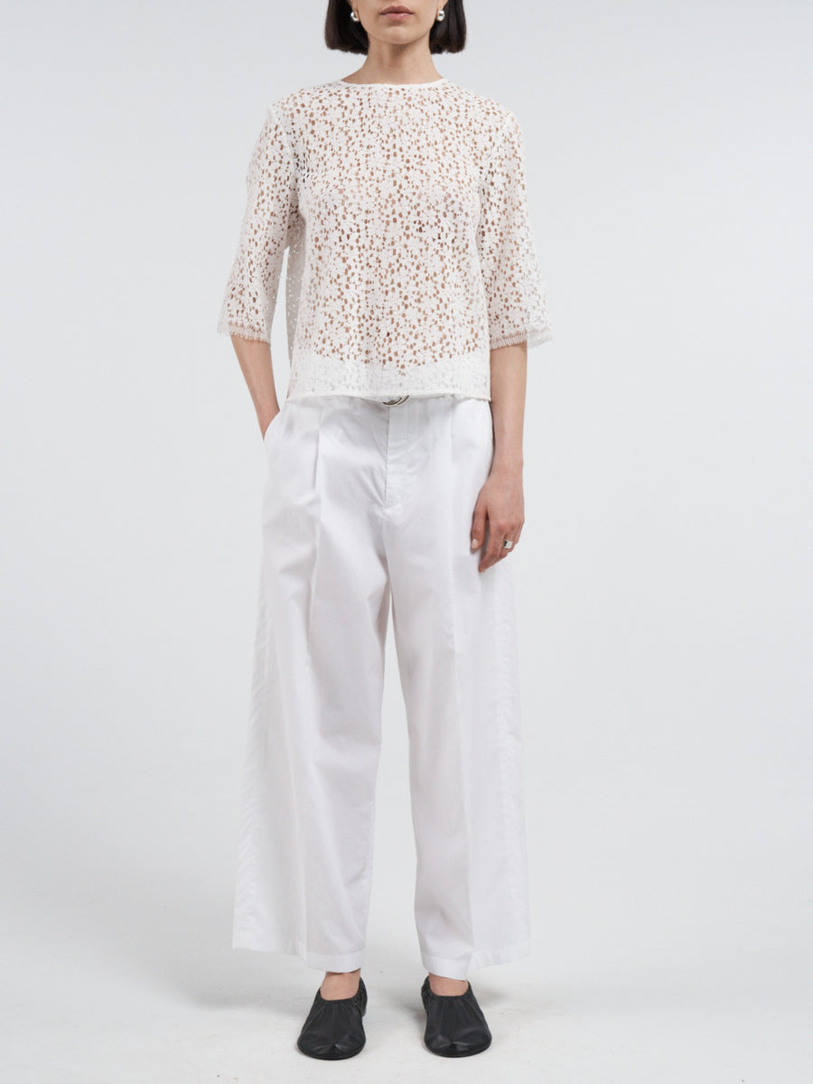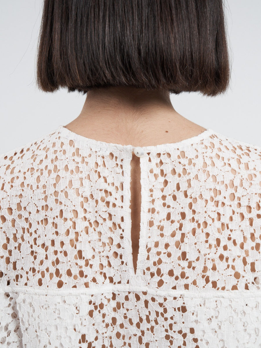 Made from Parisian-crafted organic cotton lace, this sheer t-shirt showcases two back box pleats, which create our signature cocoon-like silhouette. The keyhole back closure is finished with a single Trocas pearl shank button, while the elbow-length sleeves are adorned with intricate eyelash detailing.