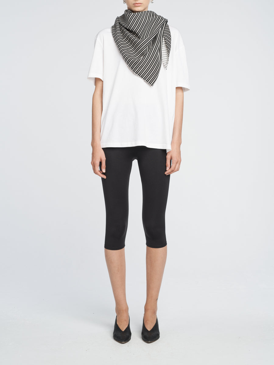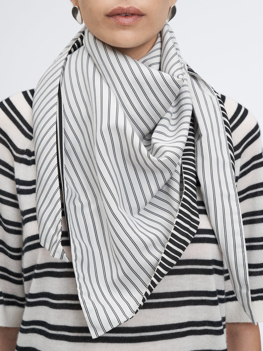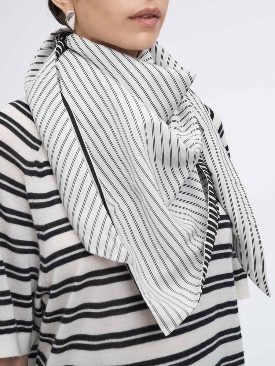 This versatile triangle scarf features dual fabrication: one side crafted from silky cotton cupro with a vintage-inspired awning stripe, and the other in a variegated stripe for a unique contrast. Whether worn as a shawl, headscarf, or top, this piece offers endless styling possibilities