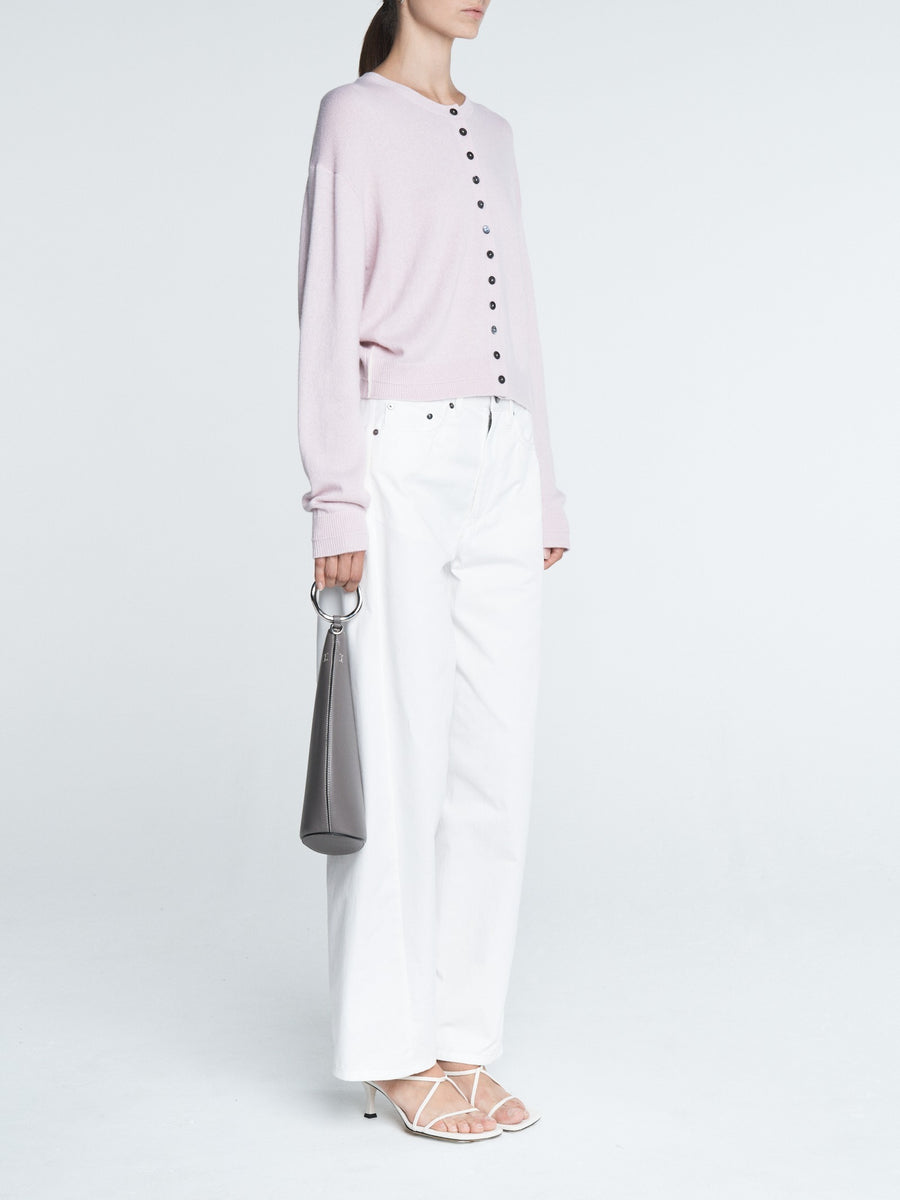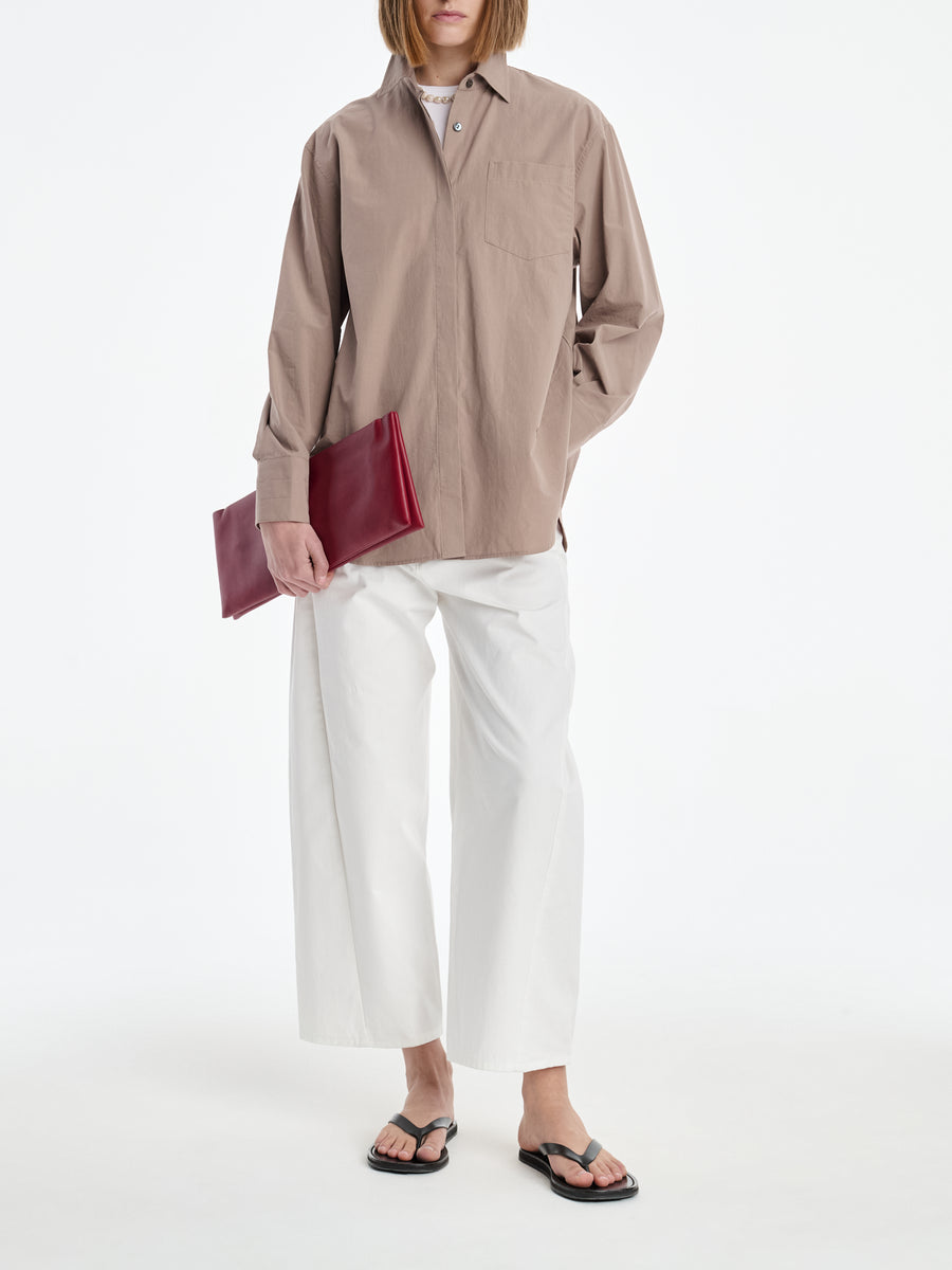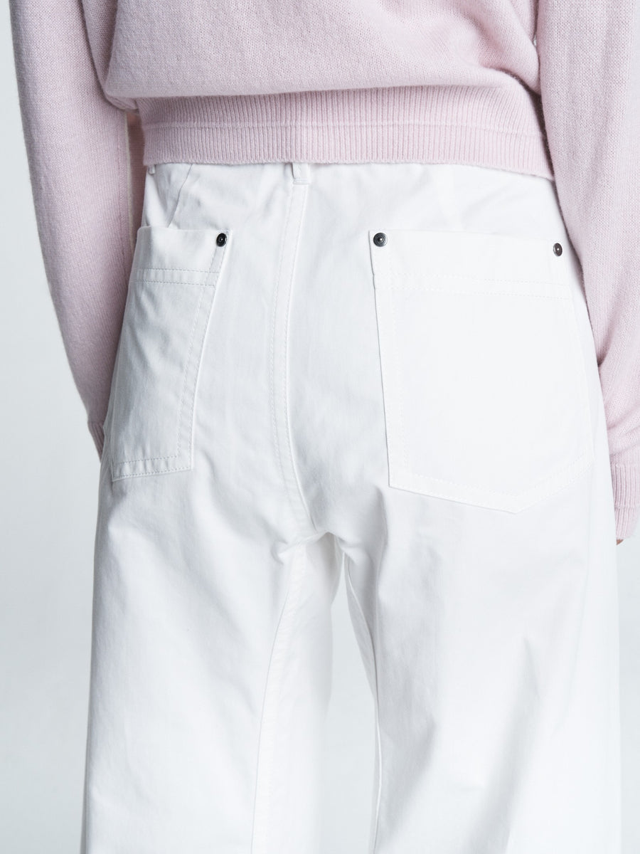 The Crescent Leg Crop in white cotton twill has an exaggerated cropped bow leg. Made from 100% organic cotton twill and perfect for a go-to everyday spring look.