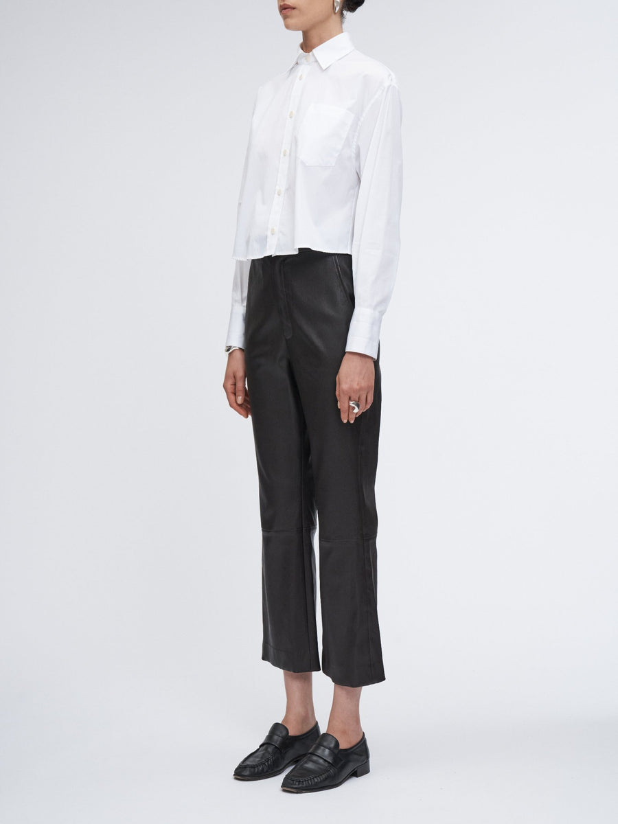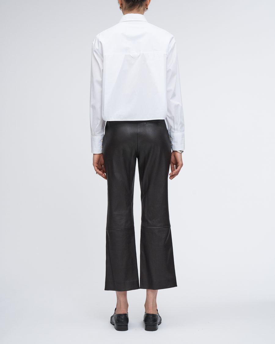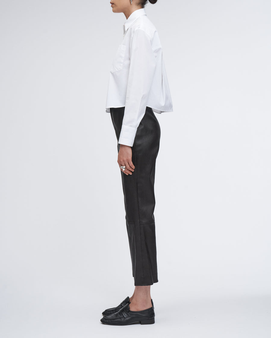 Our best selling High Waisted Crop trouser now offered in Chocolate Brown stretch leather. Made in New York City from a beautiful soft, stretch leather from a tannery in France known for their environmental practices, reducing water and chemical use in the tanning process. Featuring a high waist, slash pockets and a gentle, flattering flare at the bottom of the leg.