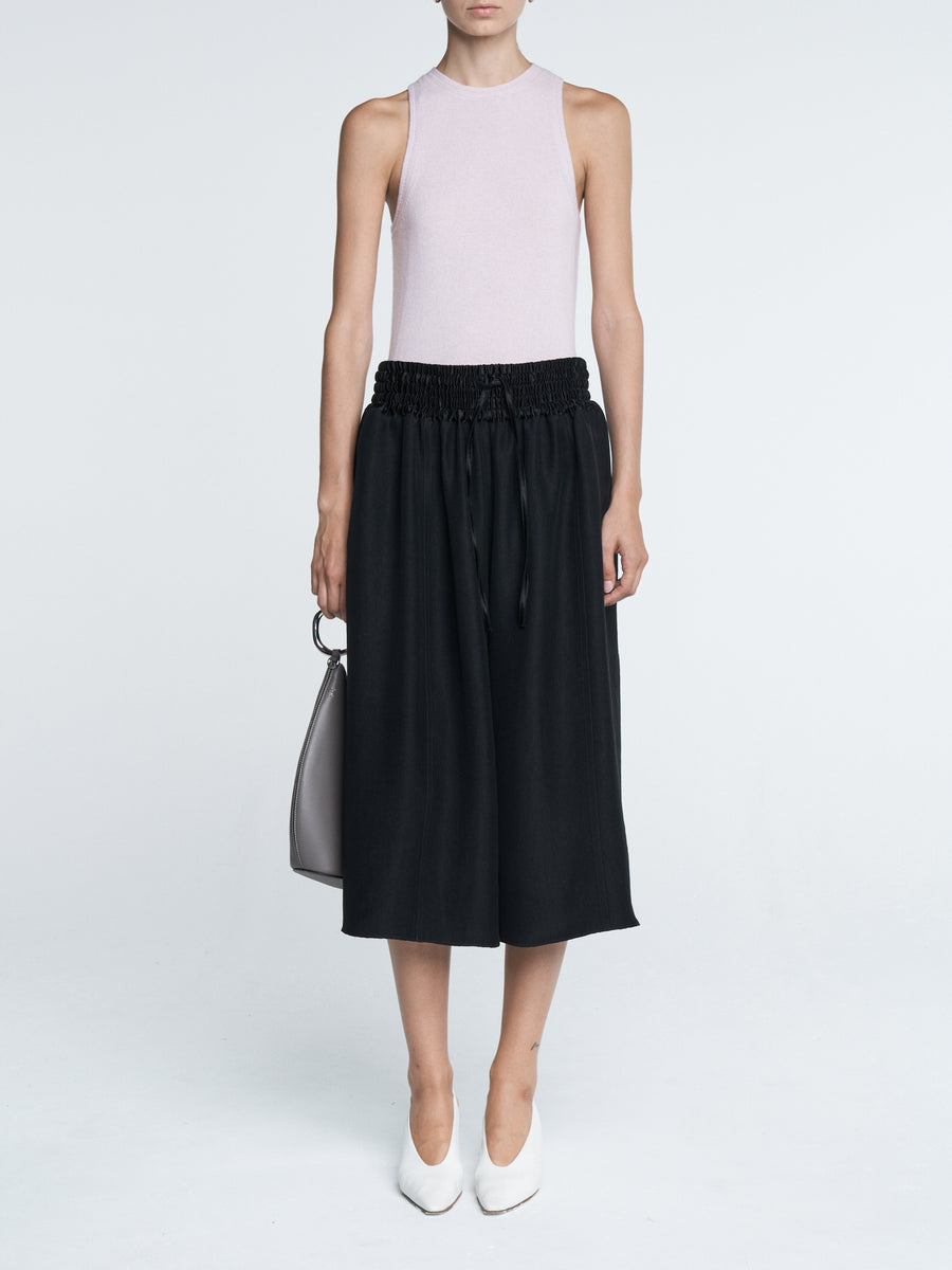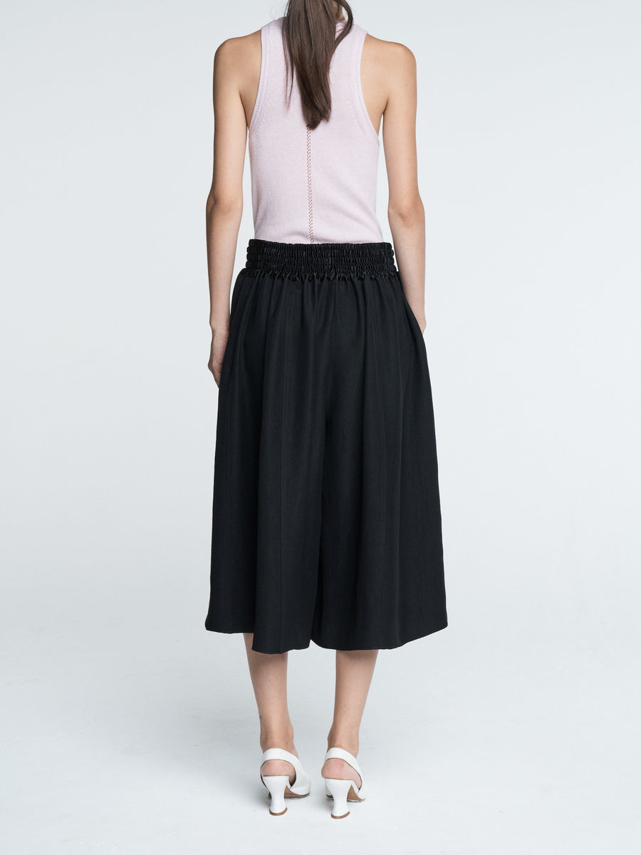 The Basketball Culotte in black Naia Renew Sateen has a wide leg, side pockets, and a smocked drawstring waistband. Can be worn with a white t-shirt and flip flops or dressed up with your favorite pair of heels.
