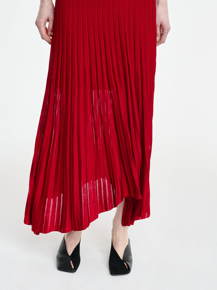 The Halter Pleat Dress in carmine red is knit in an FSC stretch viscose with a flowy, midi length, pleated, sheer skirt, fitted bodice and halter strap around the neck. The waist is slightly dropped with a shorter lining to highlight the sheerness of the skirt.