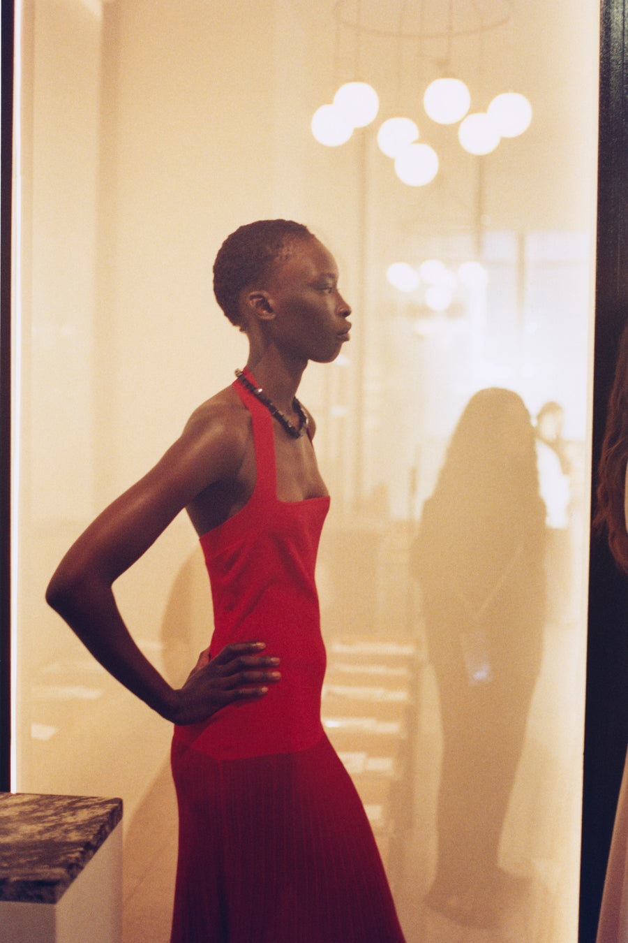 - Halter drop waist dress with pleated ankle length sheer skirt, with carmine red underskirt