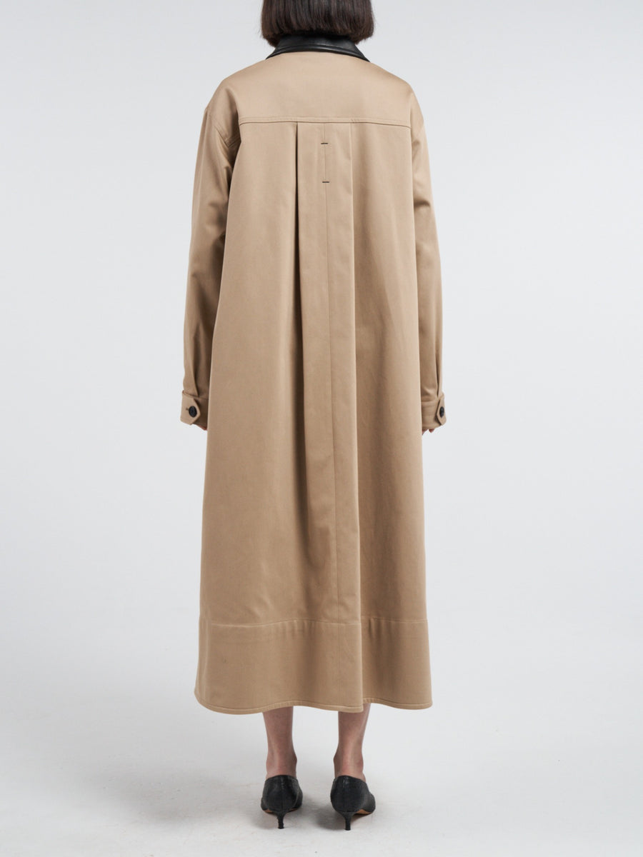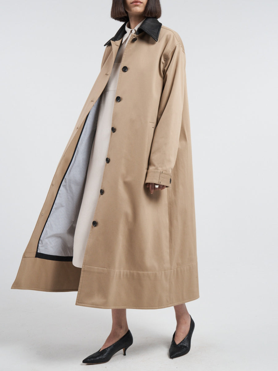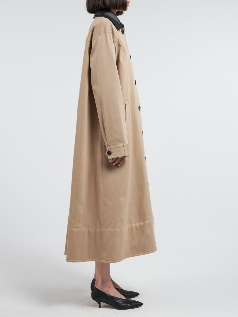 Fabricated in our signature Japanese high-twist organic cotton, this coat features an oversized "swing" silhouette for a dramatic, voluminous fit. Completed with a contrasting black lambskin leather collar and thoughtful details like our signature undercollar zig-zag stitching and contrasting black bar tacks. Inside, the coat is as meticulously crafted as the exterior, with an organic cotton pinstripe half-lining, black bias binding, and biodegradable buttons showcasing our commitment to sustainability.