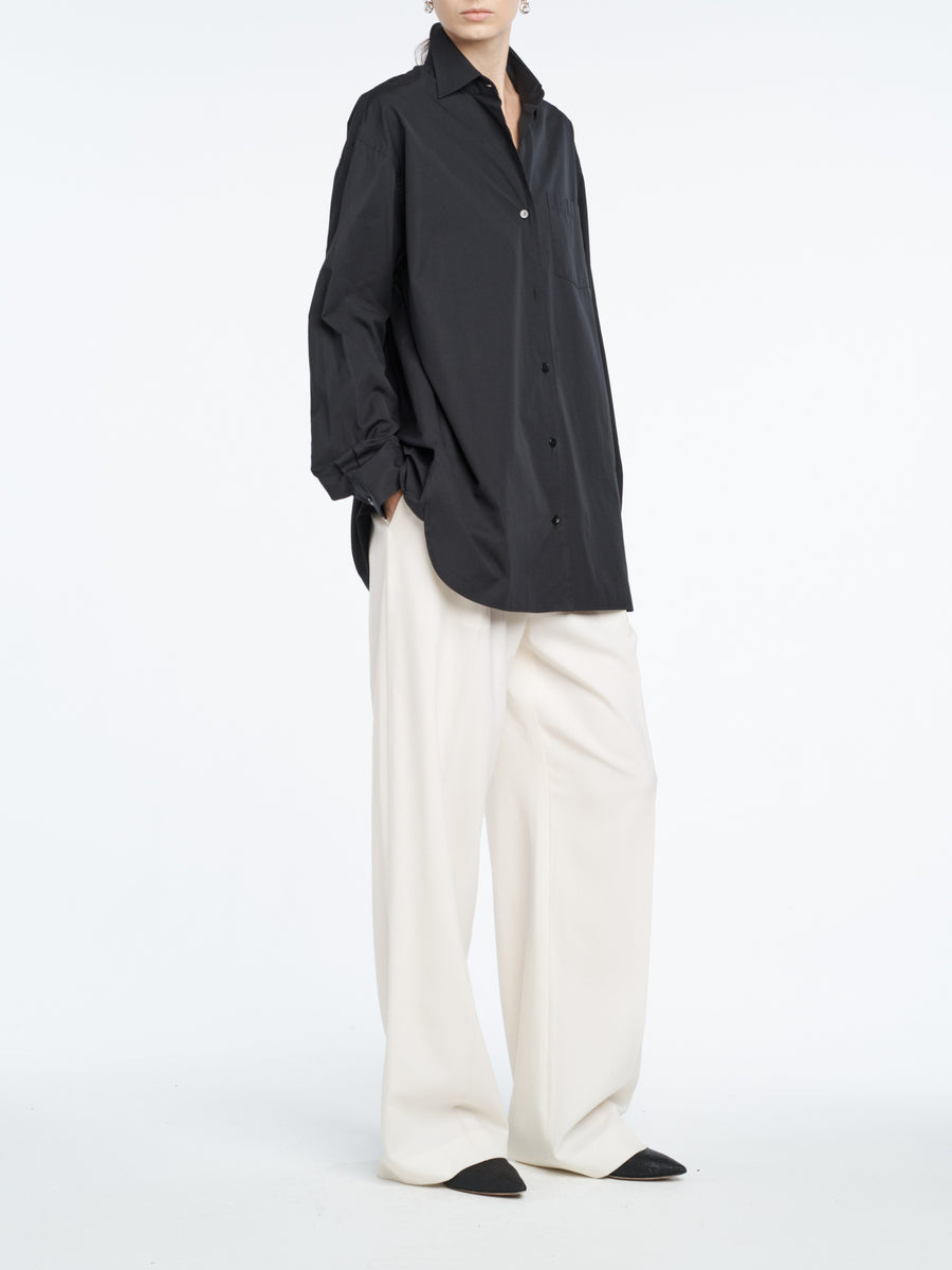 Crafted in black cotton sateen, our A-line tunic features a striking U-shaped curved side hem.