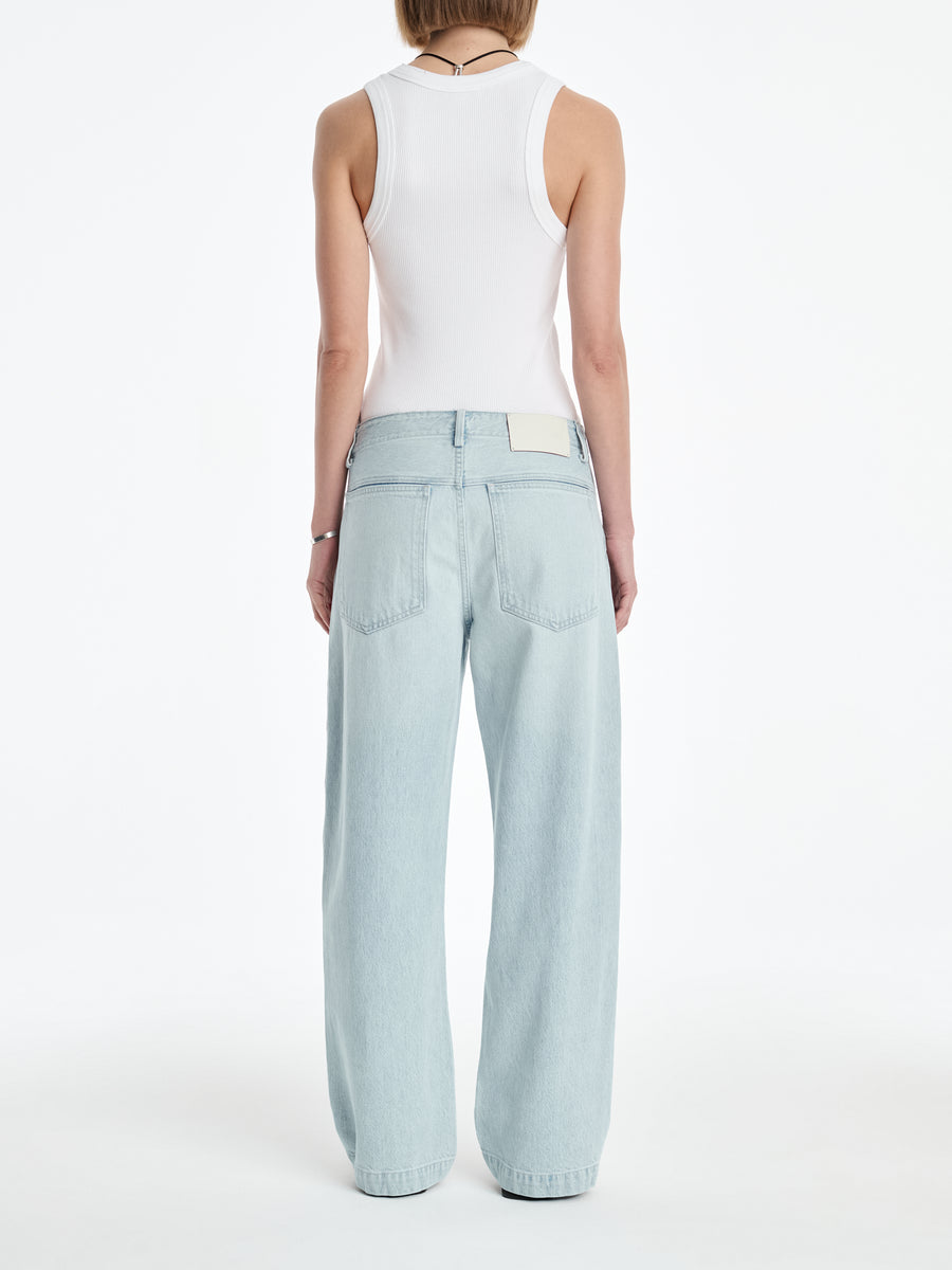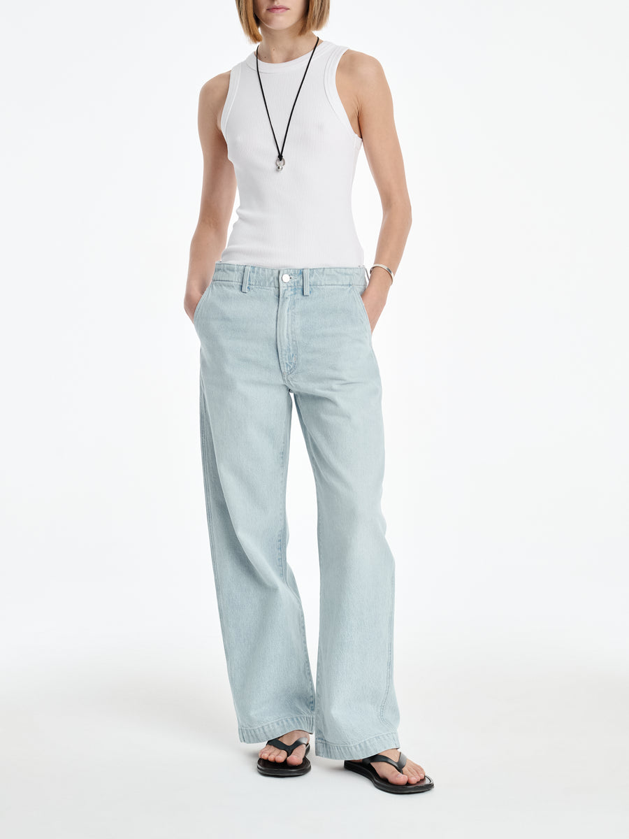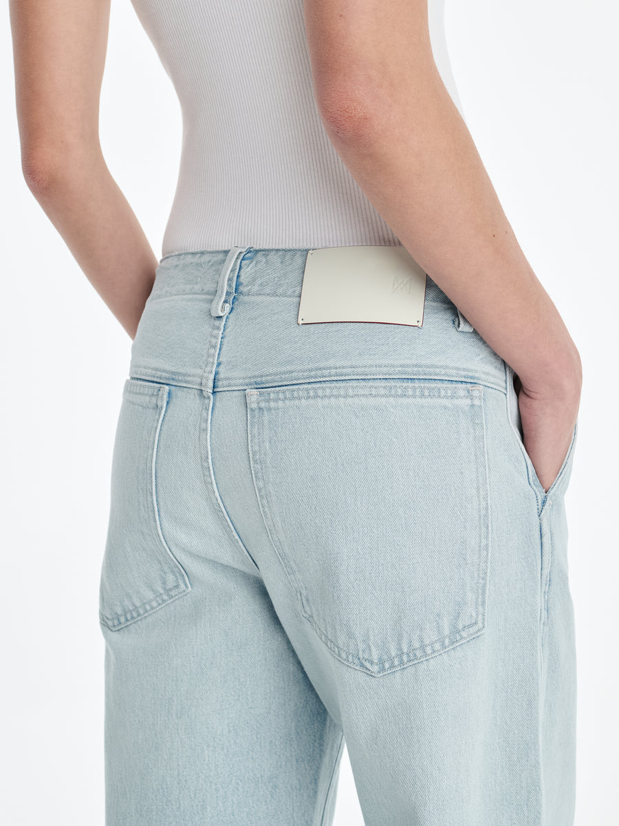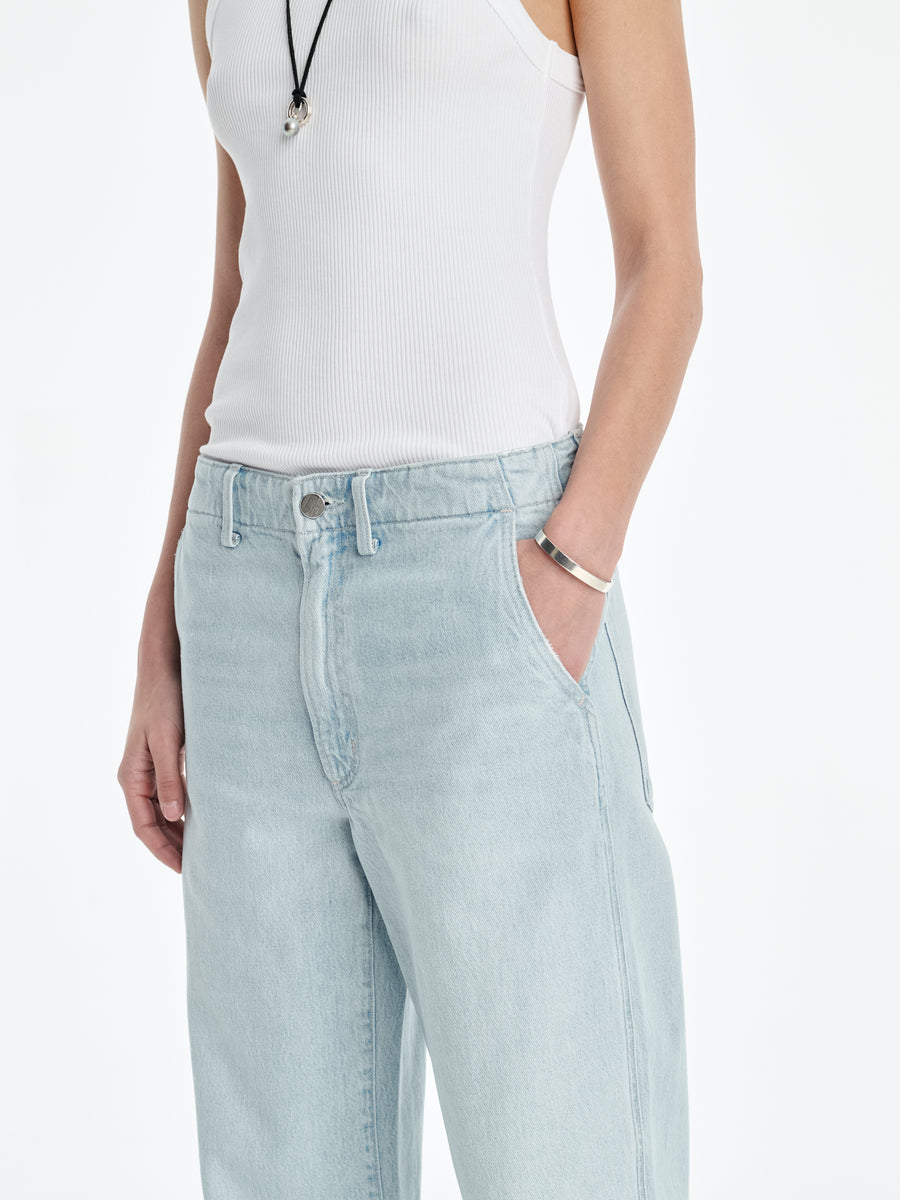 A relaxed, trouser-inspired jean in Washed Pale Indigo – a muted, timeworn shade – is composed of 67% regenerative cotton, 22% Lyocell, and 11% postconsumer recycled cotton. Its arc leg silhouette bridges tailoring and utility, with an emphasis on circular fiber innovation.
