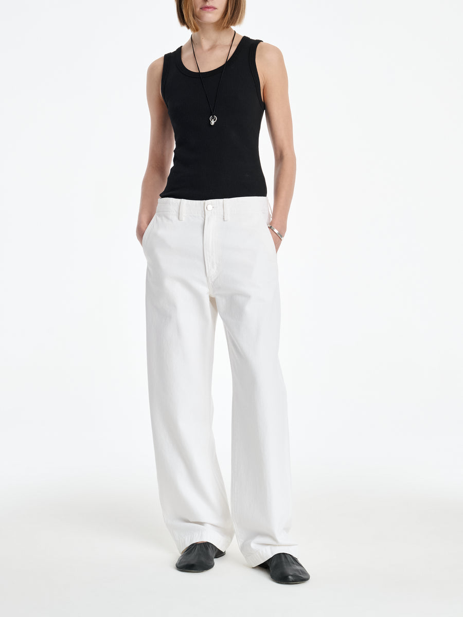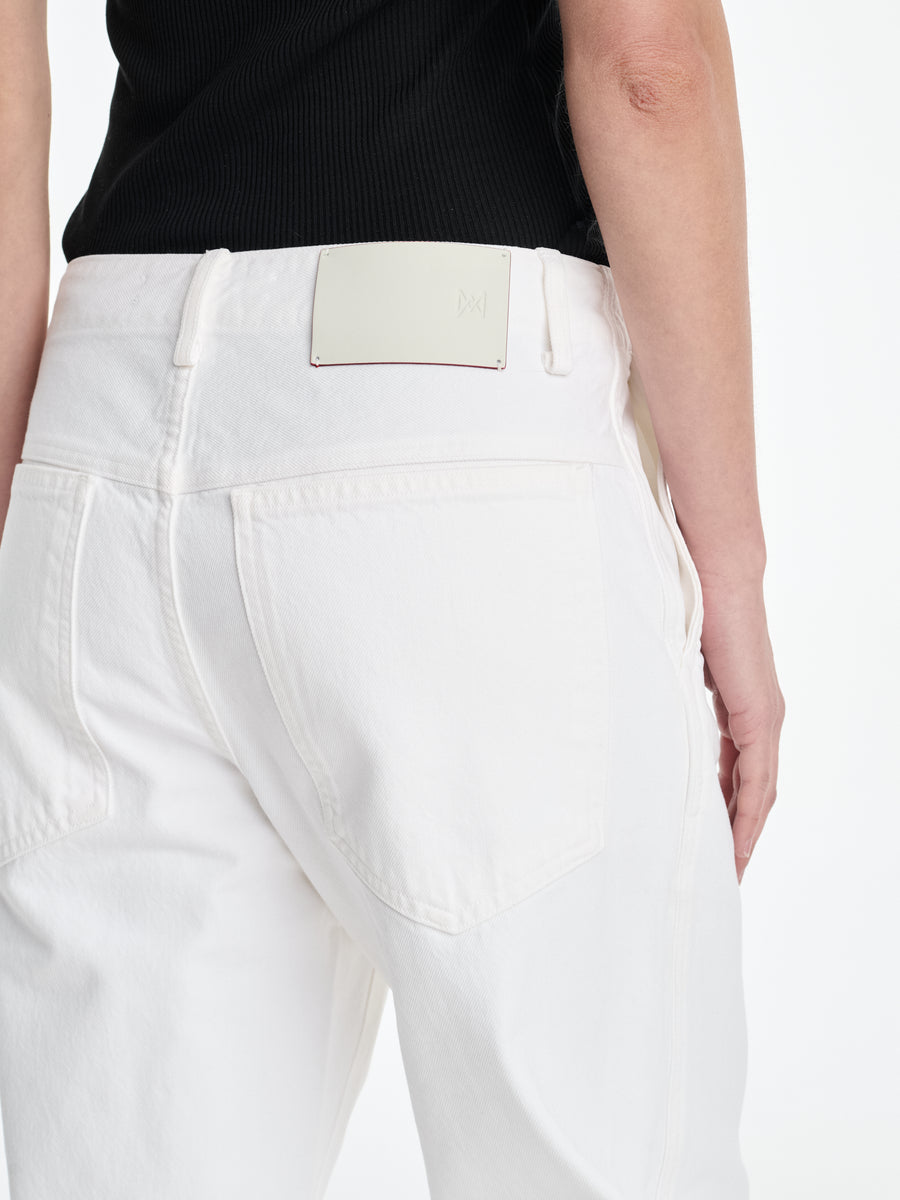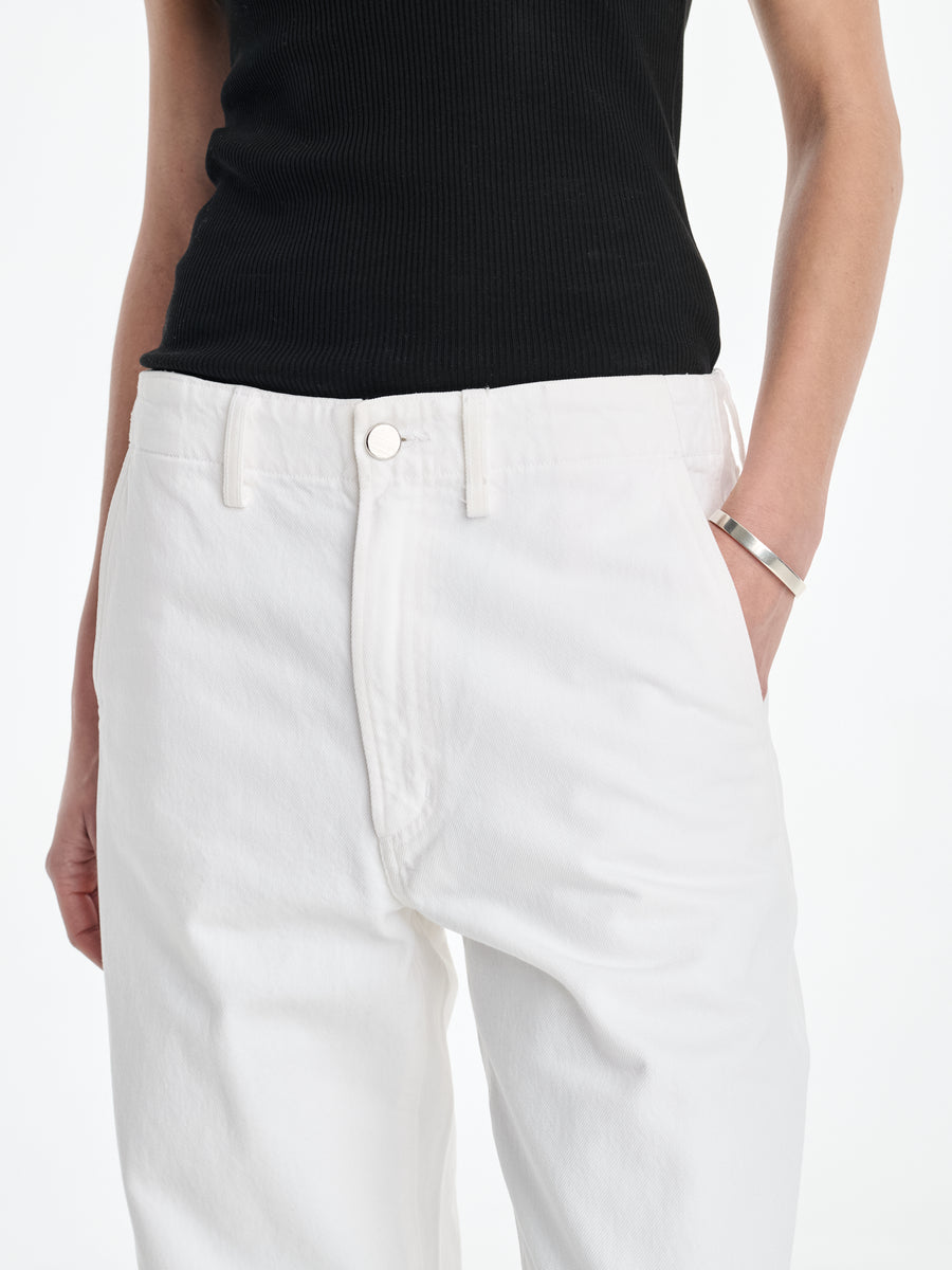 A relaxed, trouser-inspired jean in soft White Cotton is woven from 78% regenerative cotton and 22% Lyocell. Its arc leg silhouette bridges tailoring and utility, with an emphasis on circular fiber innovation.
