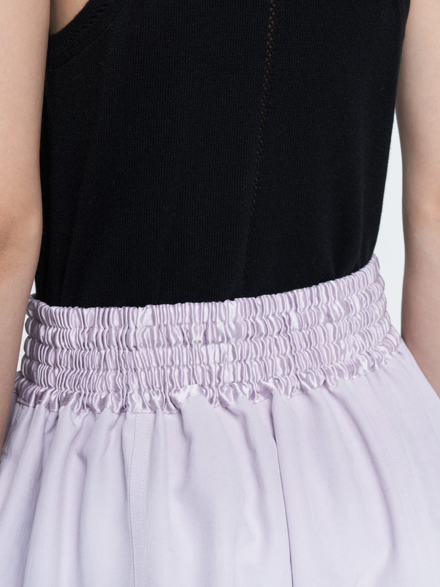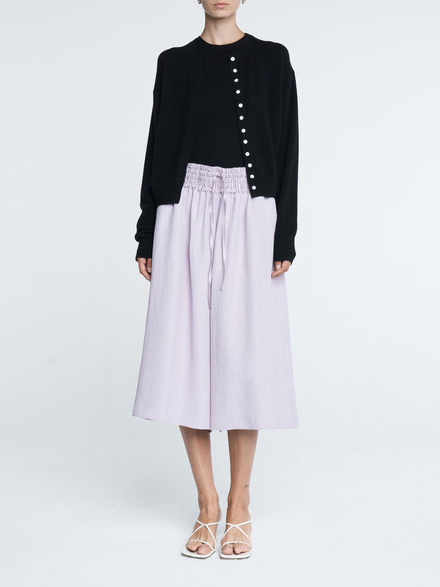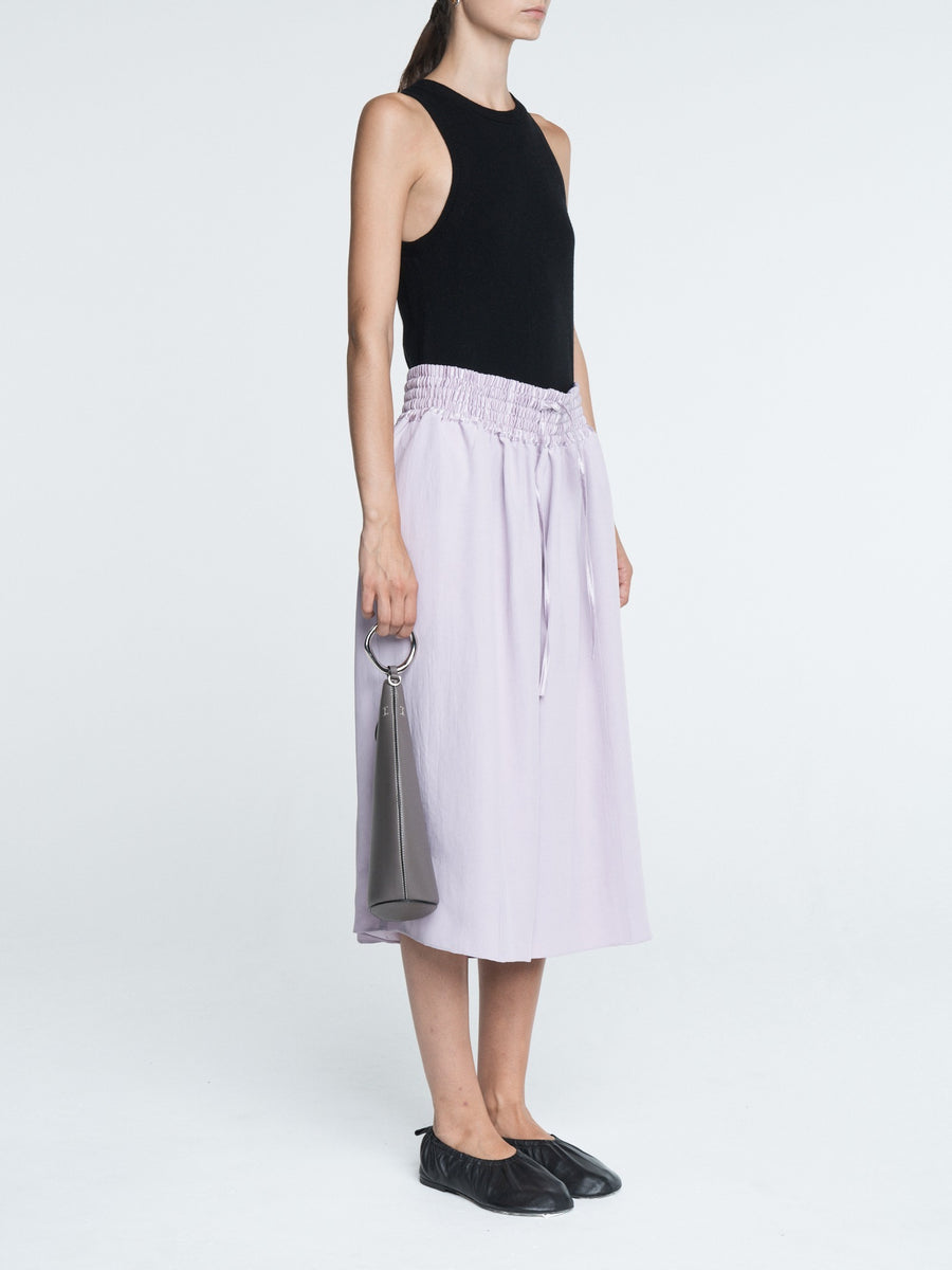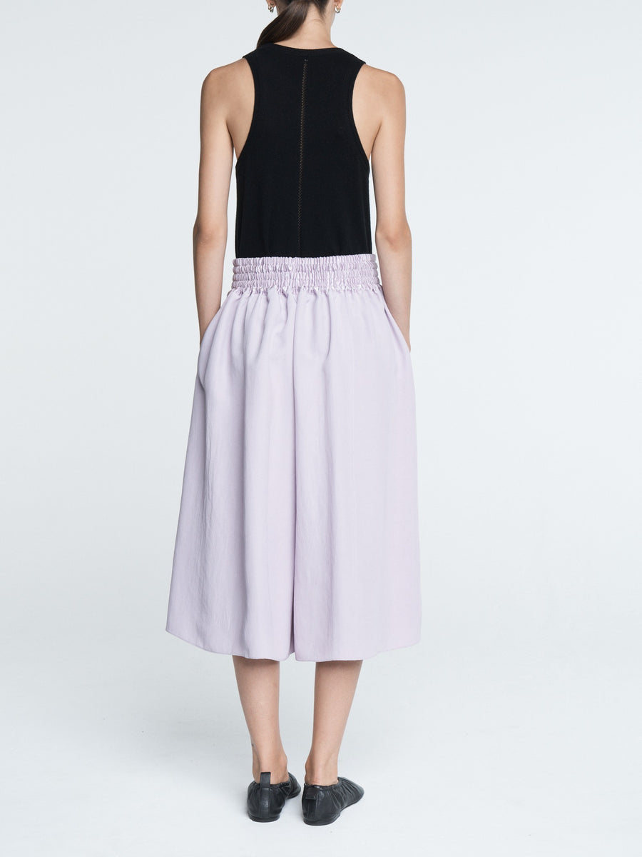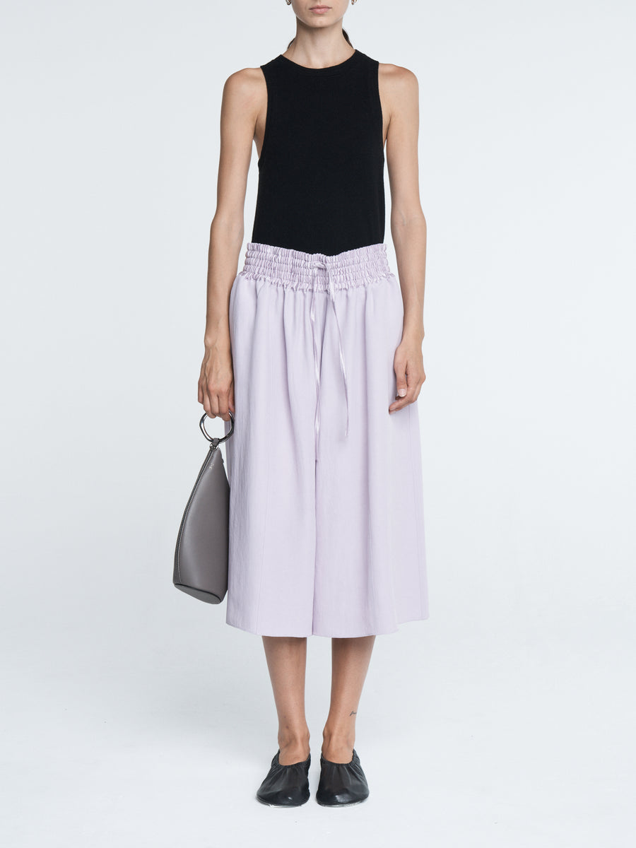 The Basketball Culotte in powder pink Naia Renew Sateen has a wide leg, side pockets, and a smocked drawstring waistband. Can be worn with a white t-shirt and flip flops or dressed up with your favorite pair of heels.