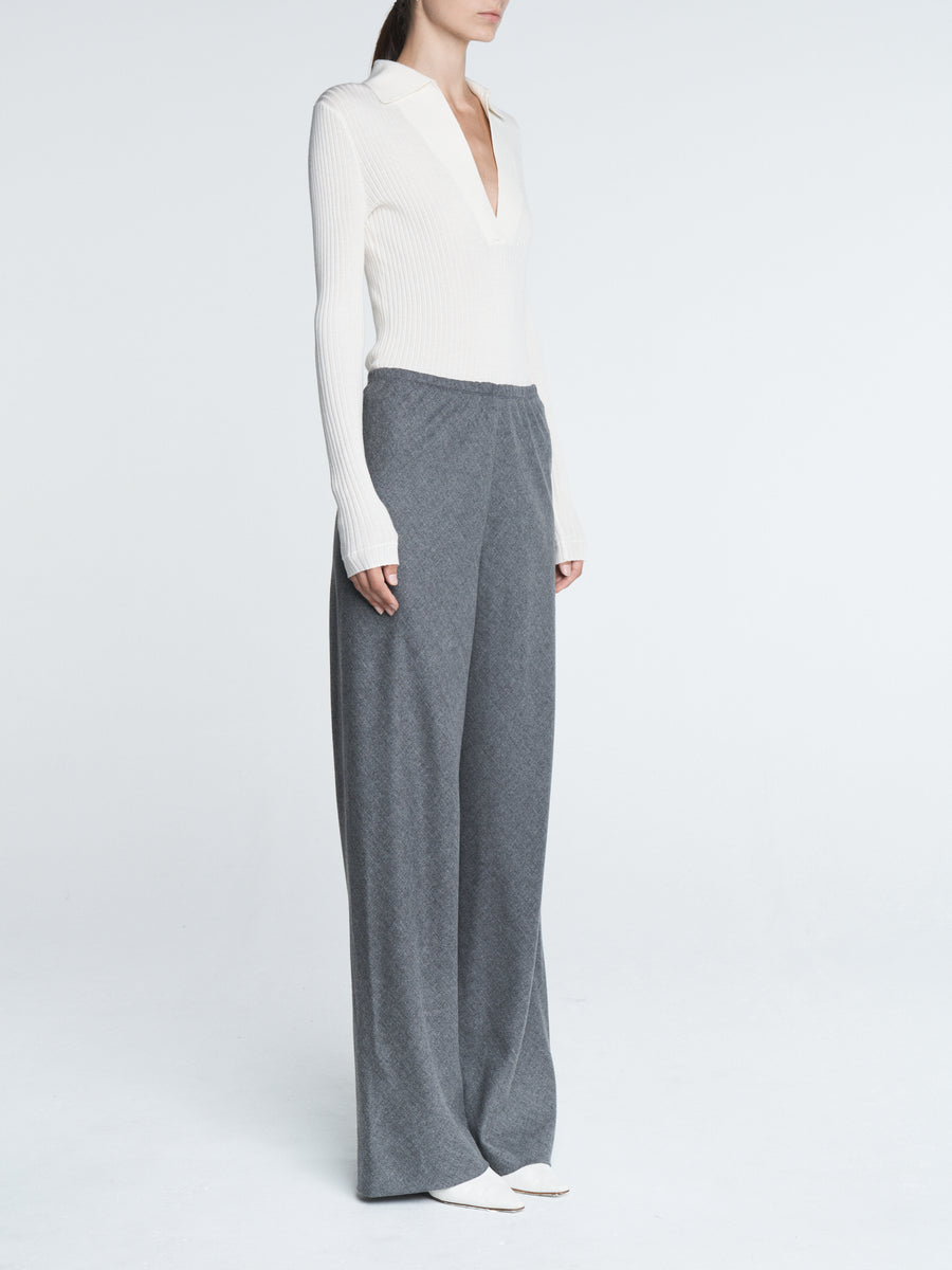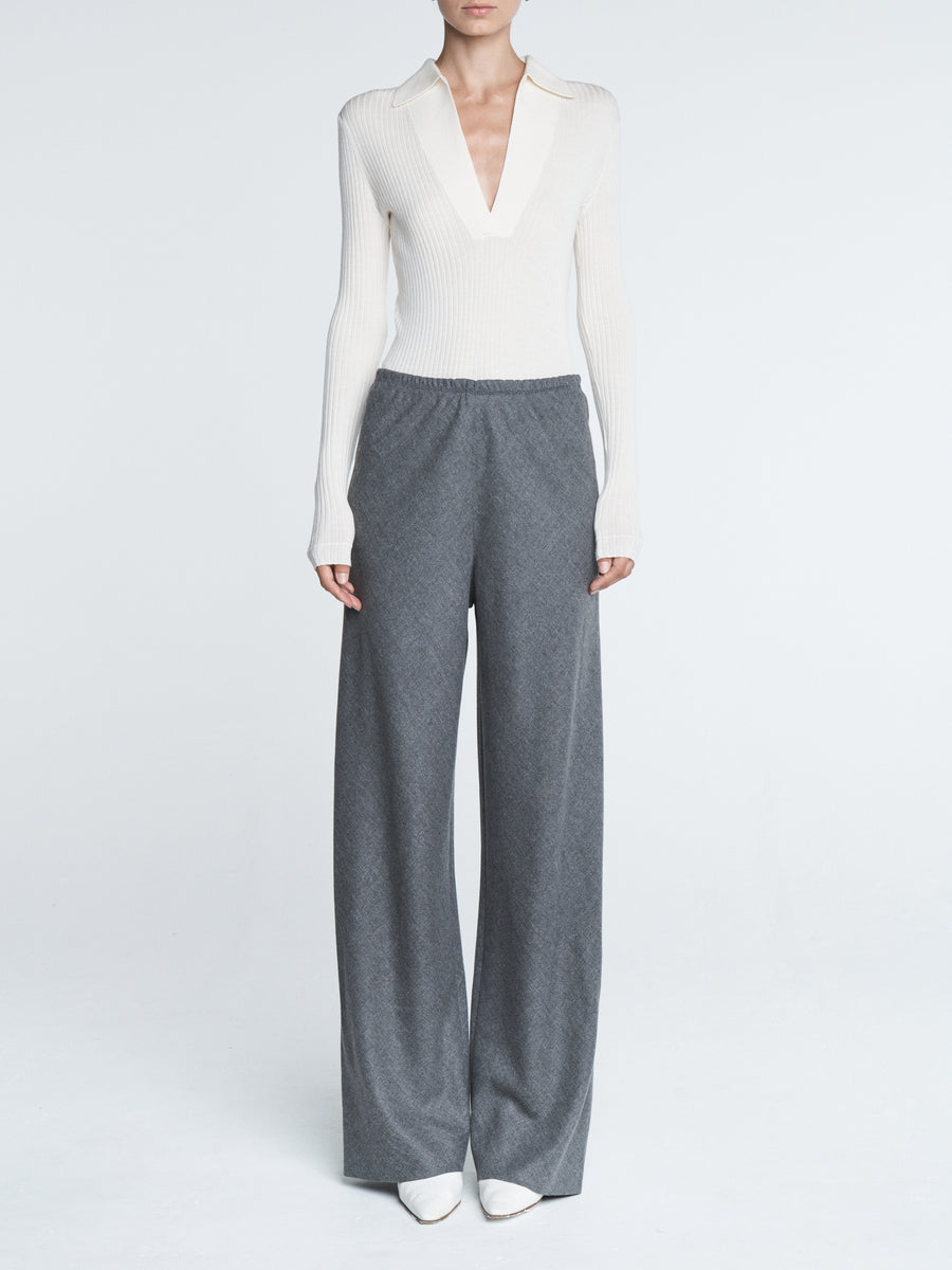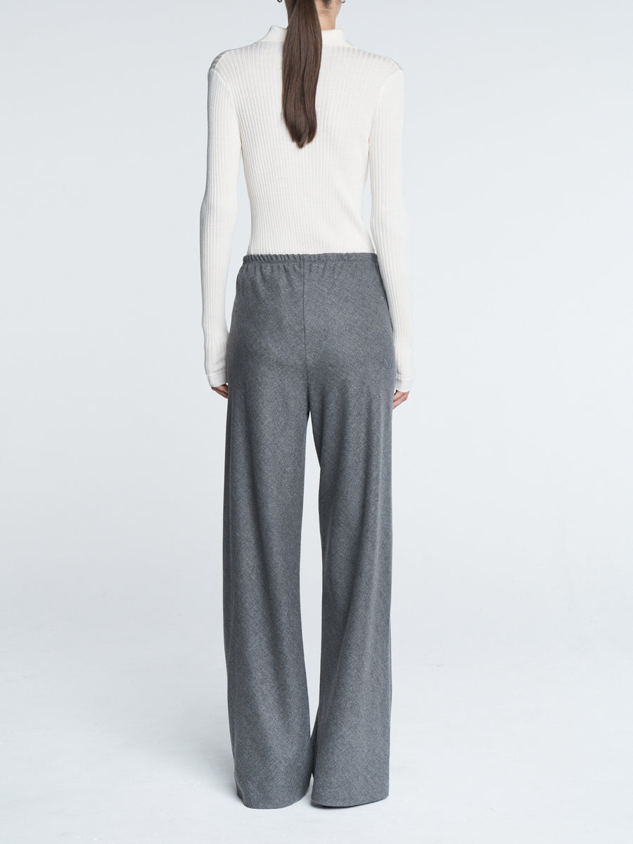 Our Bias Cut Trousers in are made in a beautifully textured, Italian charcoal wool tweed. These trousers have a a delicate elasticated waistband, creating a very easy fit. They skim the hips and have a relaxed wide leg shape.