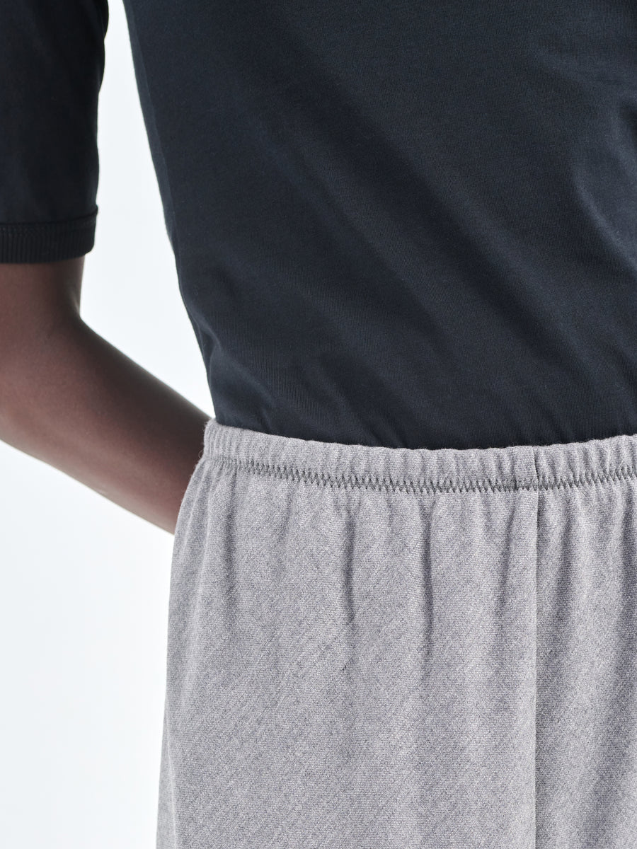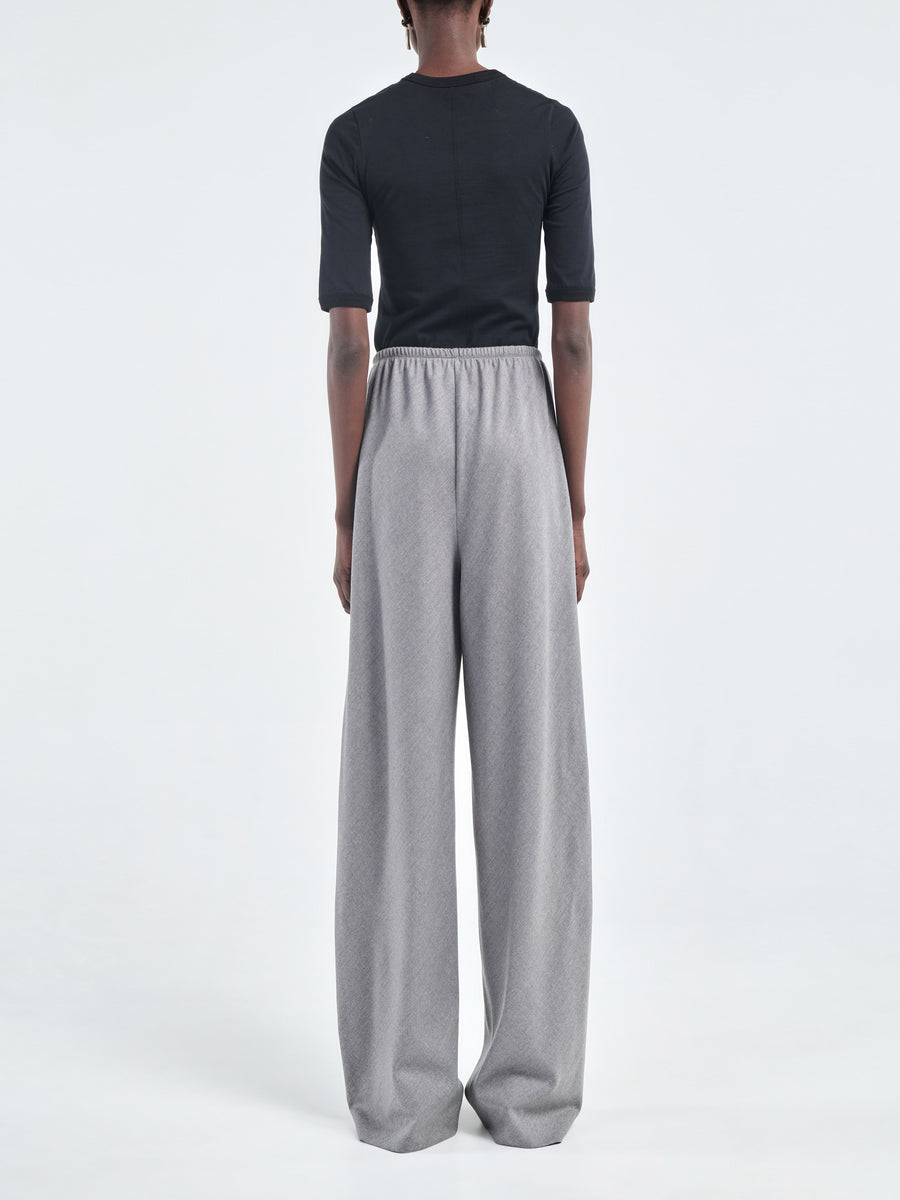 Our Bias Cut Trousers in Heather Grey are made in a beautiful, drapey Italian wool flannel. These trousers have a a delicate elasticated waistband, creating a very easy fit. They skim the hips and have a relaxed wide leg shape.