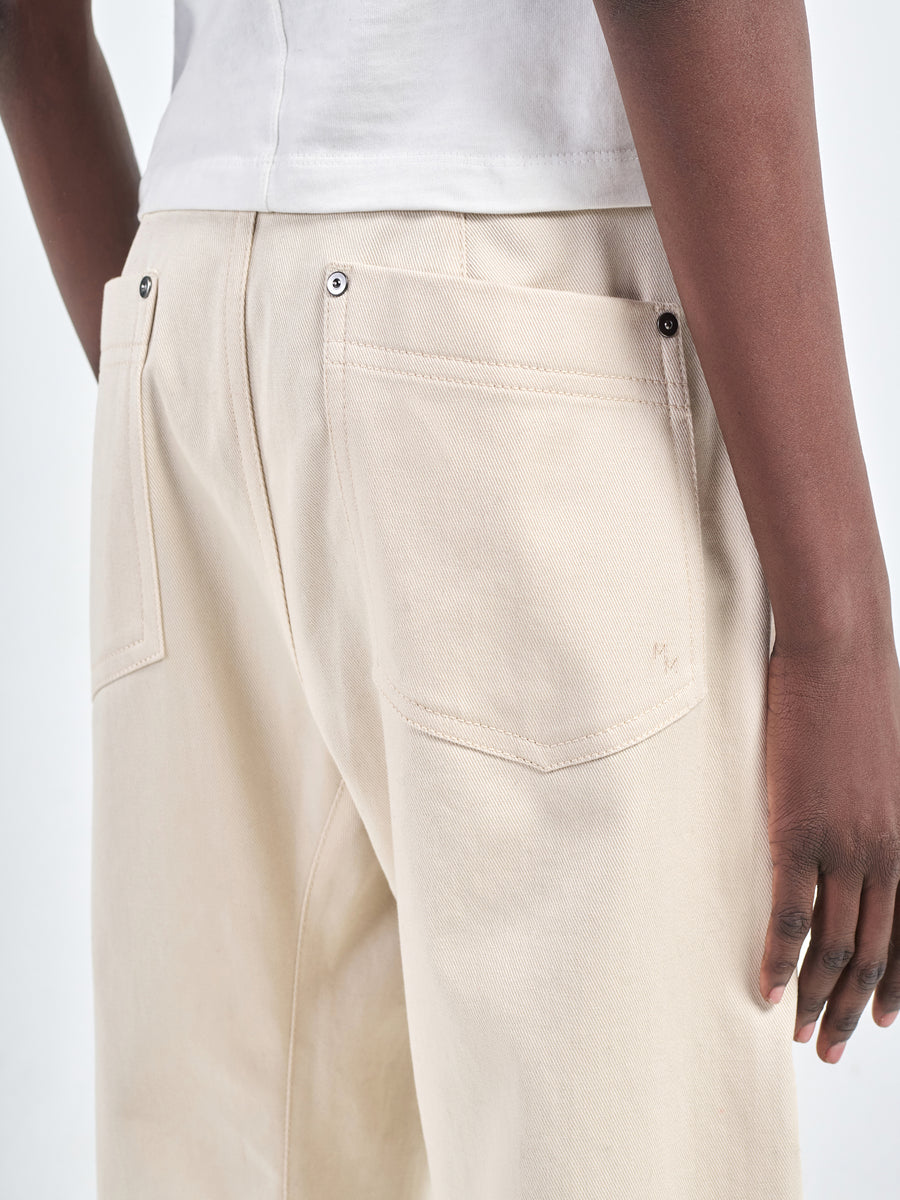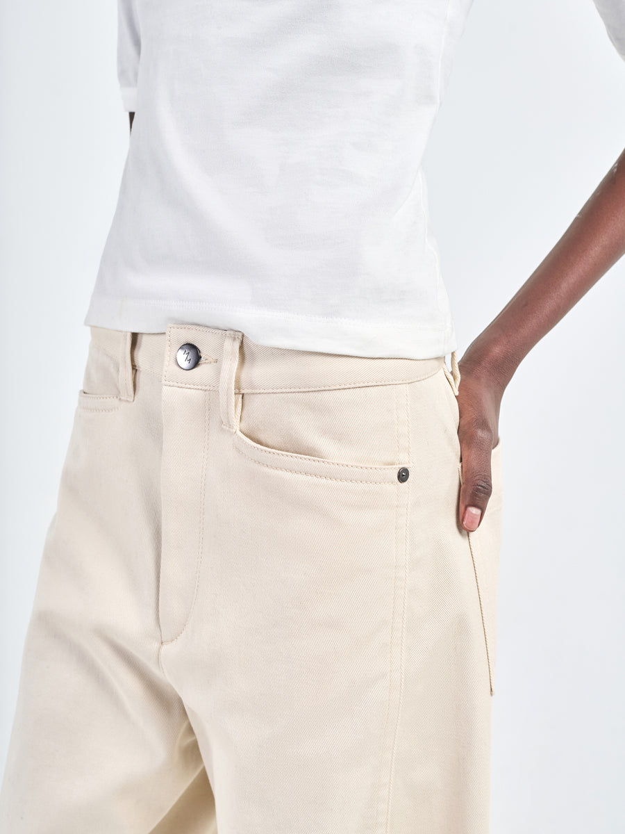For Fall, our best-selling Bow Leg Crop Jean is made in a more structured organic cotton denim to really hold the articulated curve of the leg shape. They feature diagonal slash pockets at the front, twisted side seams, darts at the back waistband for a more flattering fit, and our signature recycled metal hardware. The ivory colorway is perfect with white and fall greys.
