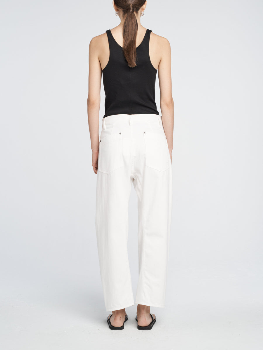 Crafted from organic Japanese cotton denim, the bow-leg jean features a unique twist along the side seam, curving gently inward for a sculptural shape. With a slightly cropped, curved hem, these jeans retain classic elements, including 5-pocket detailing, recycled monogram metal shank button, rivets, and a back yoke.