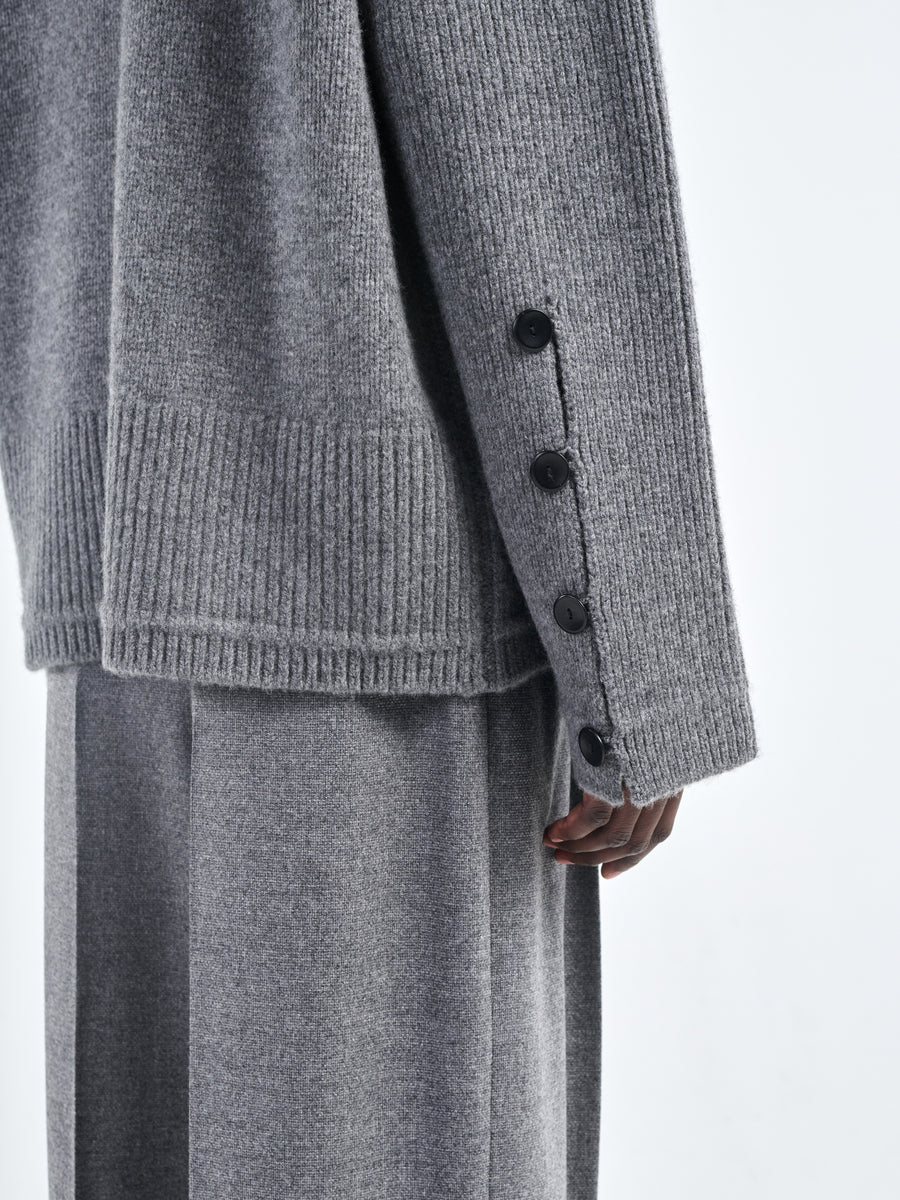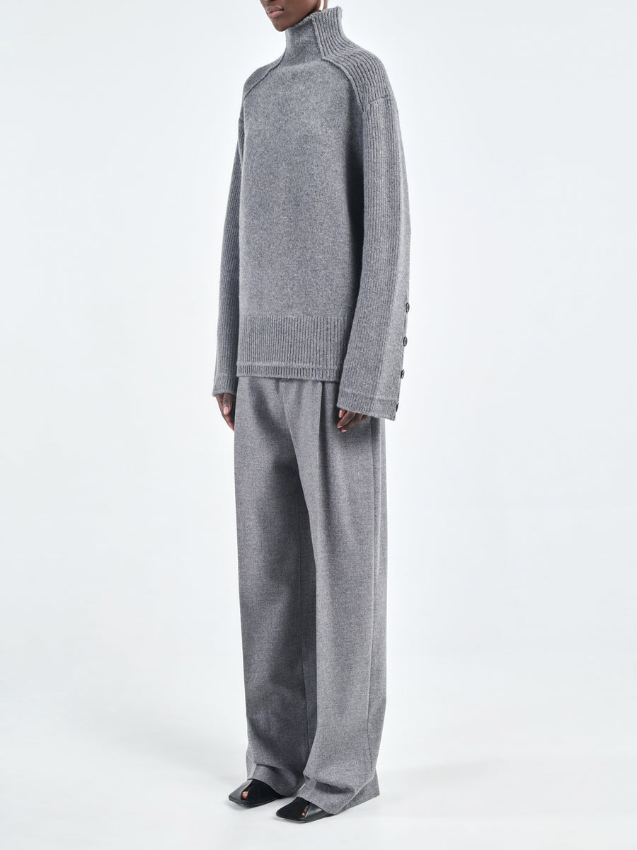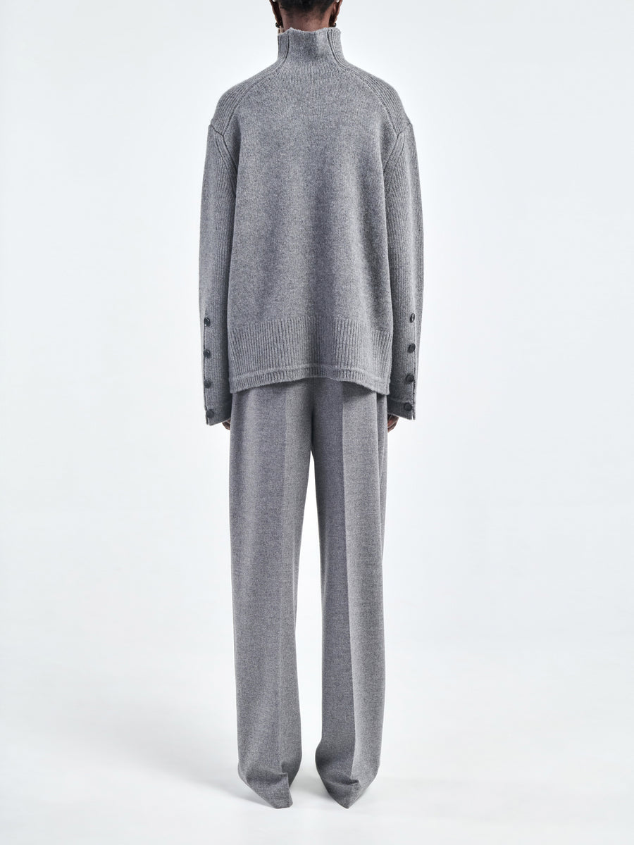 Oversized mock neck sweater in medium heather grey Italian wool-cashmere blend. Finished with signature corozo buttons at the sleeves.