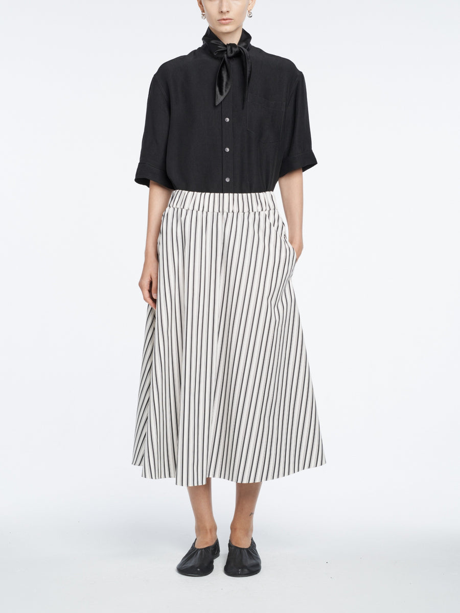 This circle skirt is made of 100% organic cotton sateen in an ivory and black stripe. Featuring an elastic waistband, a slight flare, and hidden pockets.