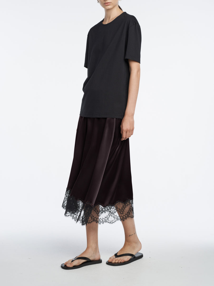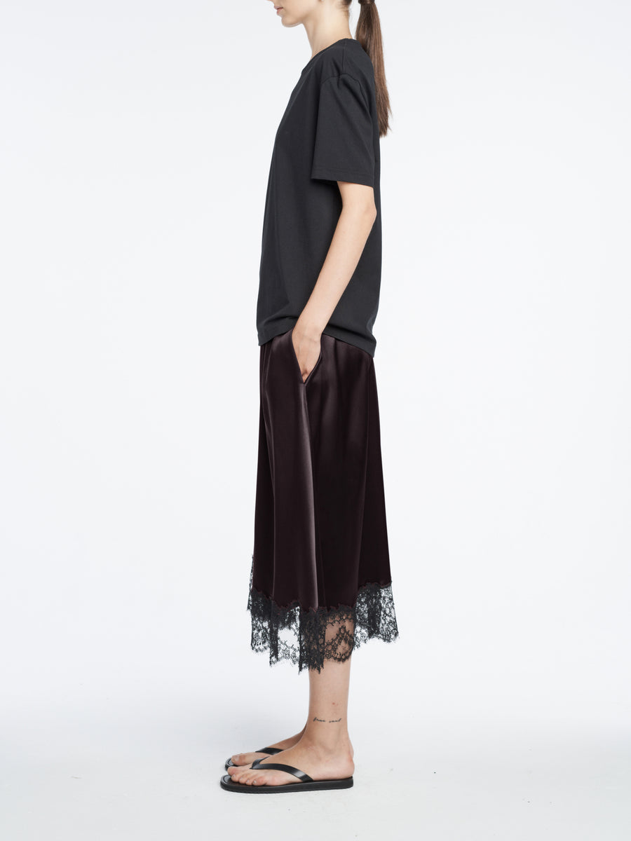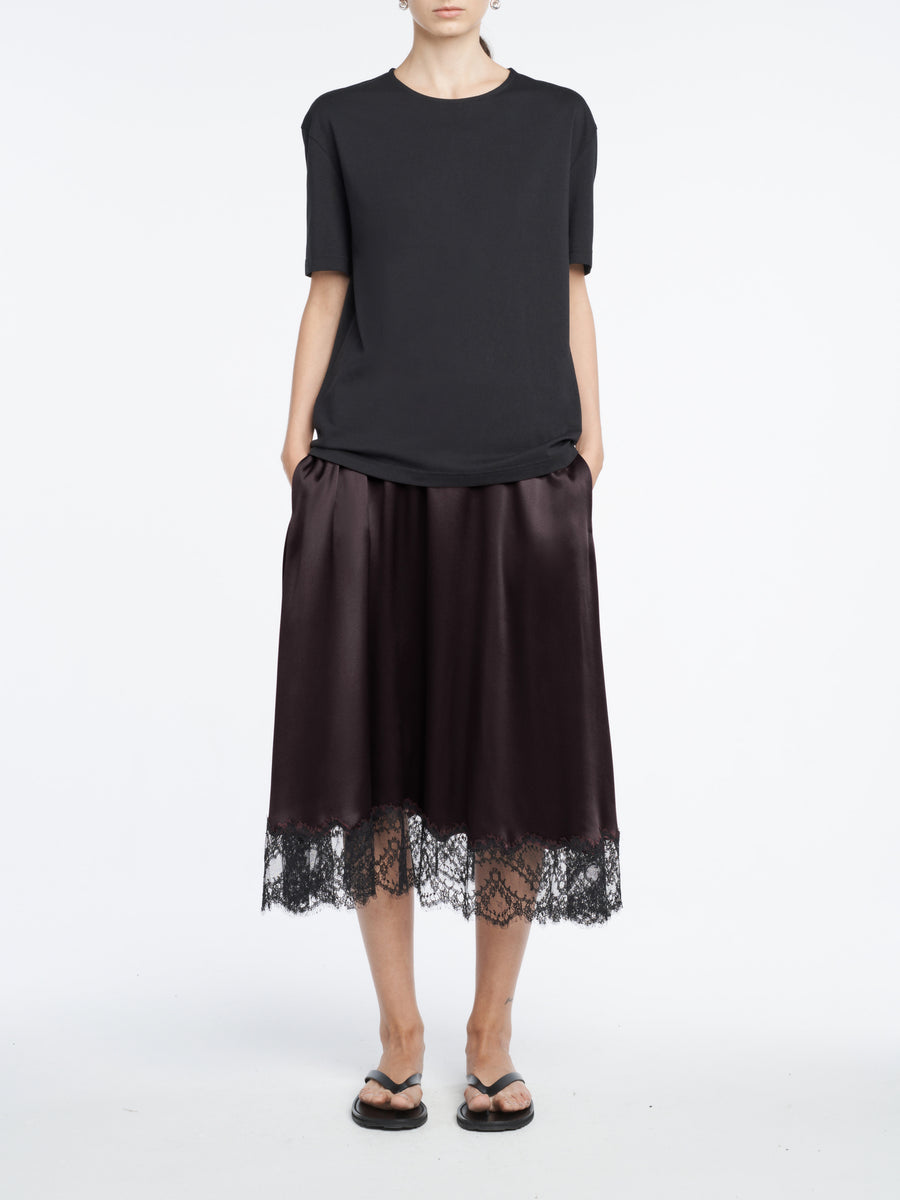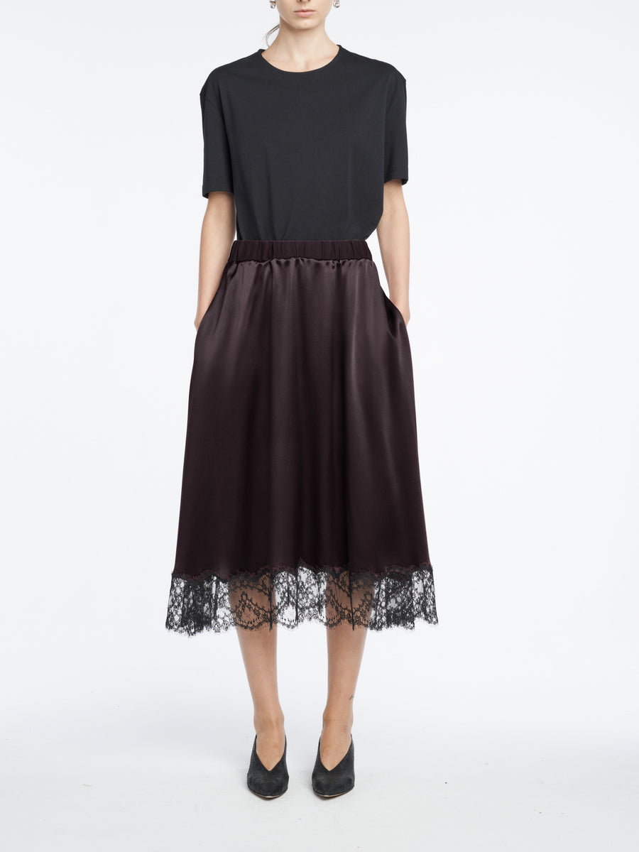 This locally-made circle skirt is made of lustrous plum Japanese Naia Renew Sateen and finished with black lace cutout detail just below the knees. Featuring an elastic waistband, a slight flare, and hidden pockets.