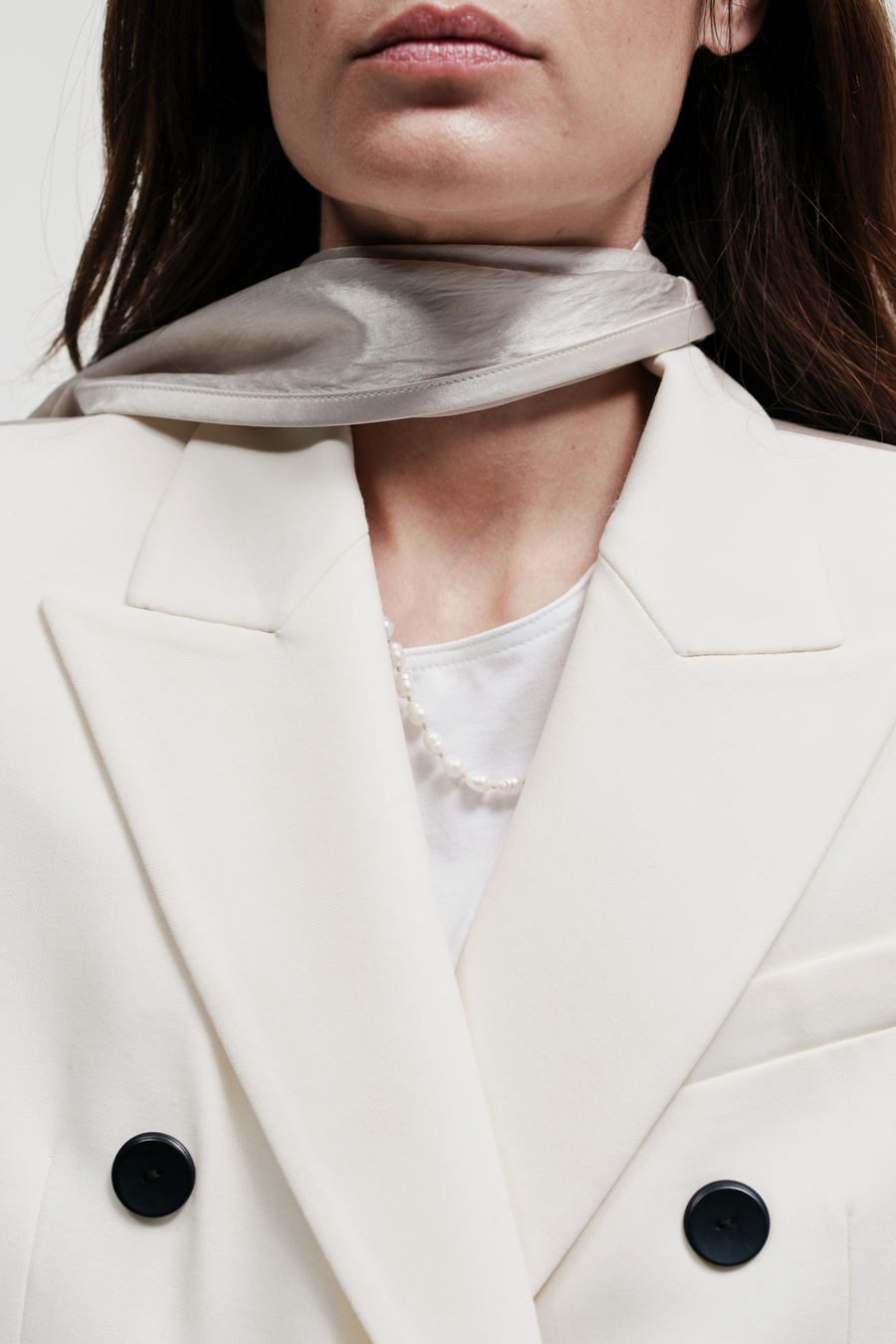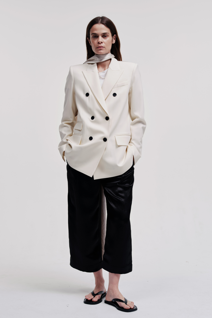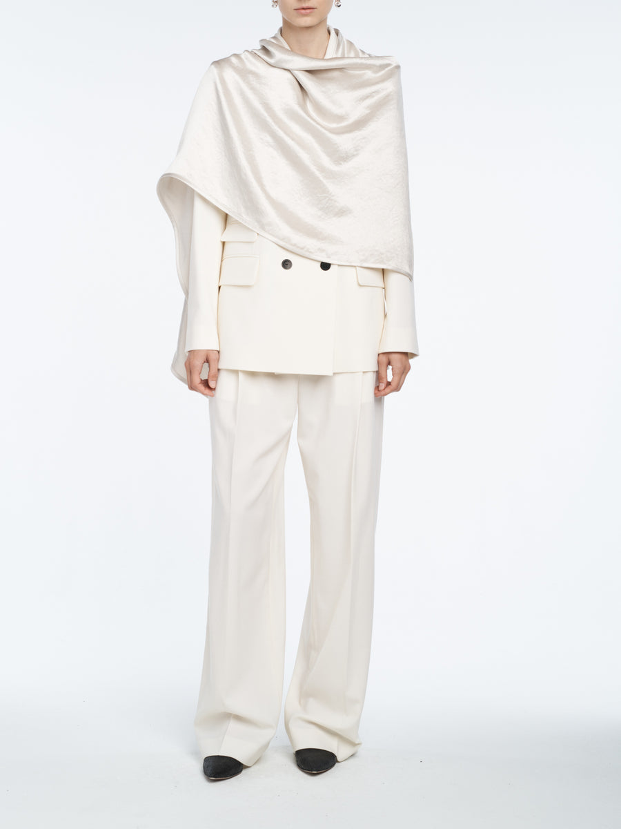 Our best-selling Double Breasted Cloak Blazer in an ivory Responsible Wool basketweave. Defined by a matching ivory Naia sateen detachable coat and our signature corozo buttons.