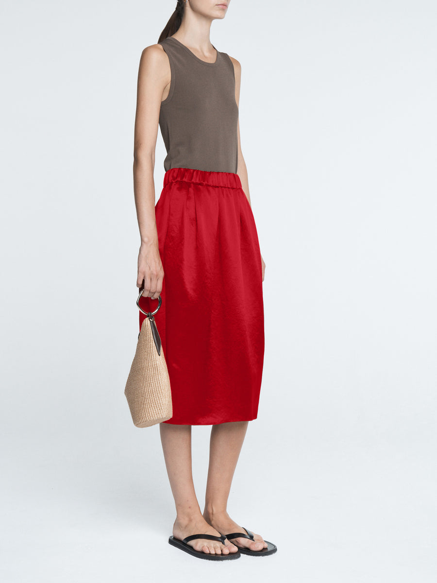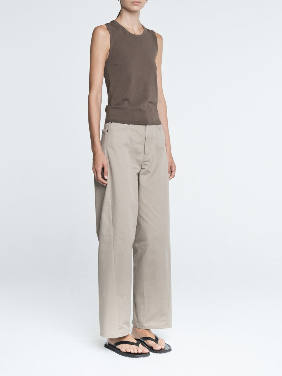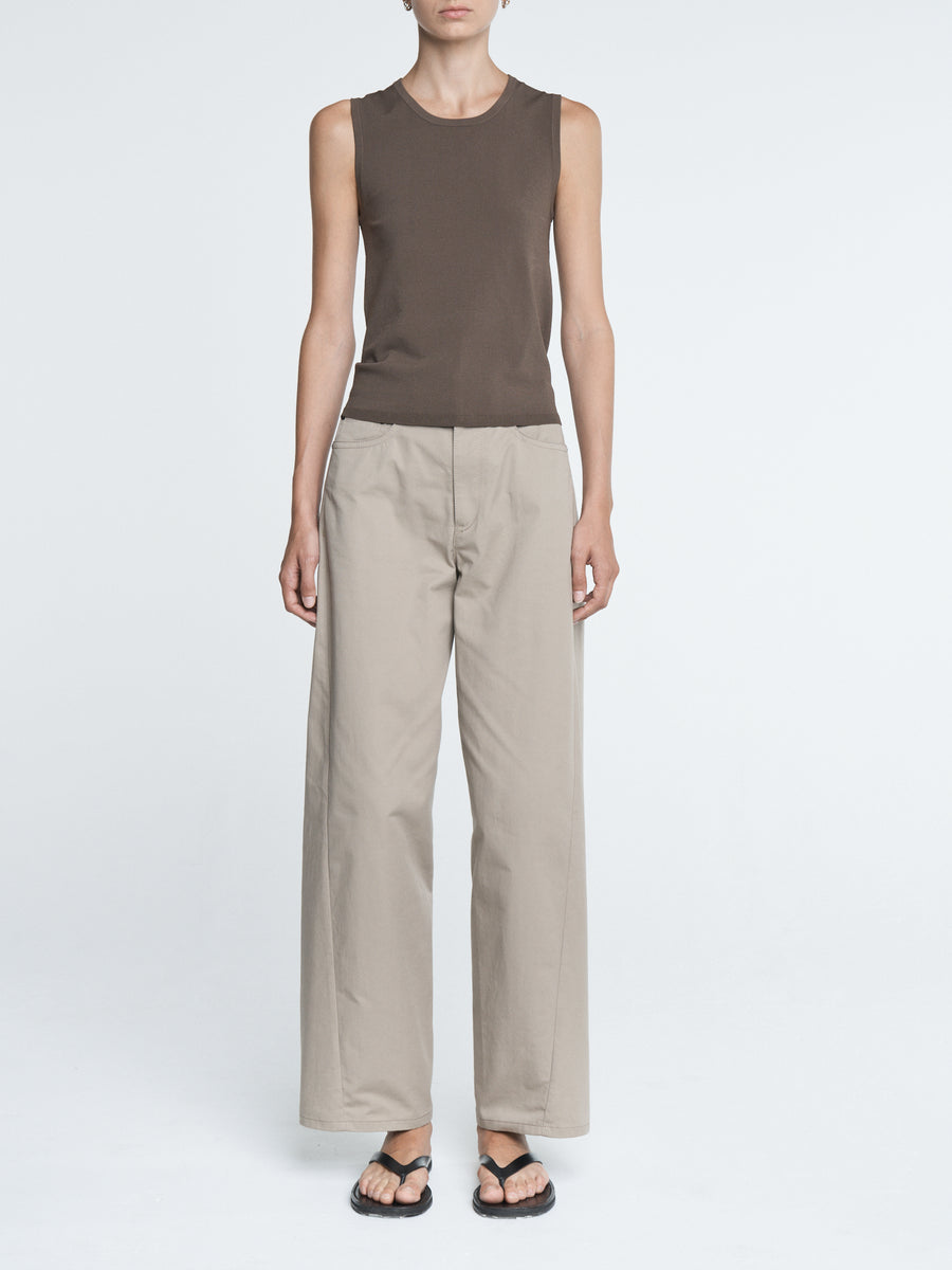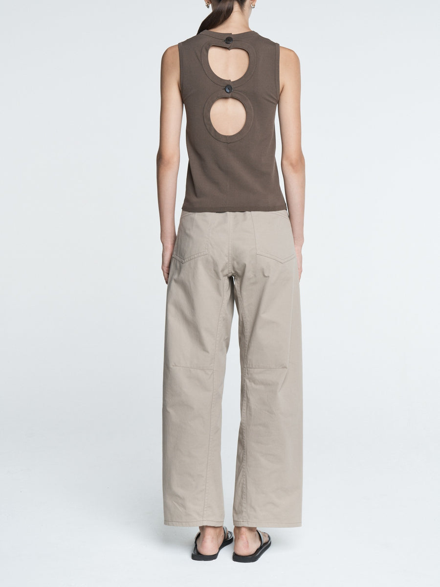 The Double Keyhole Top in taupe is knit in a stretch viscose, with a form-fitting tank bodice, has a crew neck and is sleeveless. The back has a bra-friendly double keyhole detail with large shell buttons.