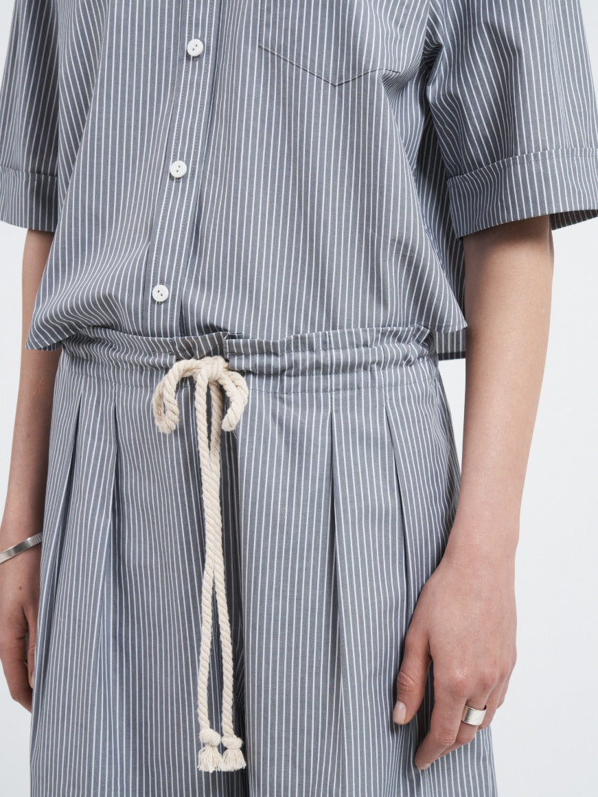 A new fabrication of our best selling drawstring pant. This Grey railroad striped cotton relaxed, cozy pant combines the comfort of loungewear with the styling and fabrication of a trouser. Featuring an elasticated waistband, front pleats and braided rope drawstring, it brings an elevated ease to everyday wear.
