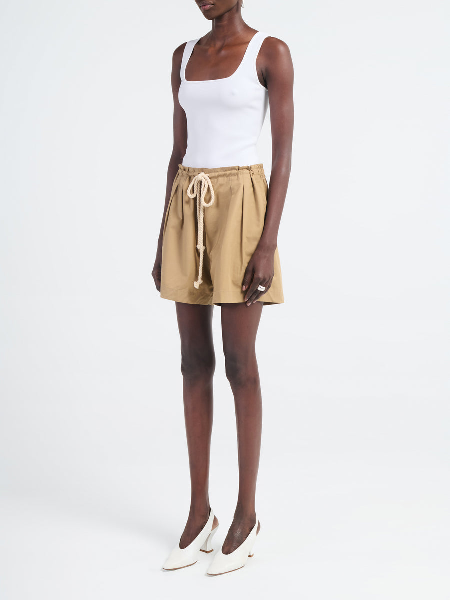 Developed from our organic Japanese cotton in a rich walnut hue. Designed for effortless summer styling, with a front drawstring, pleats, and an elasticated waistband at the back.