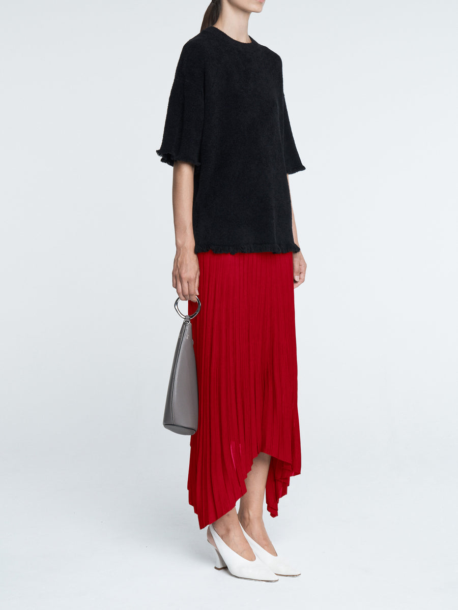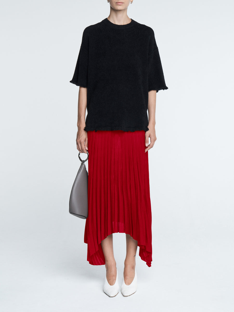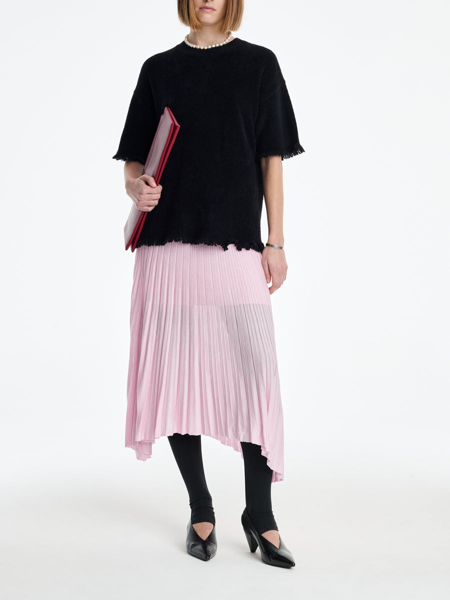 The Fray T is knit in the softest, organic cotton velour in black. It has a relaxed fit, drop shoulder, longer length and frayed edges at the shoulder and bottom hem. Pairs perfectly with the Sheer Pleat Skirt in powder pink or black.