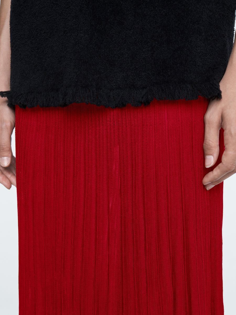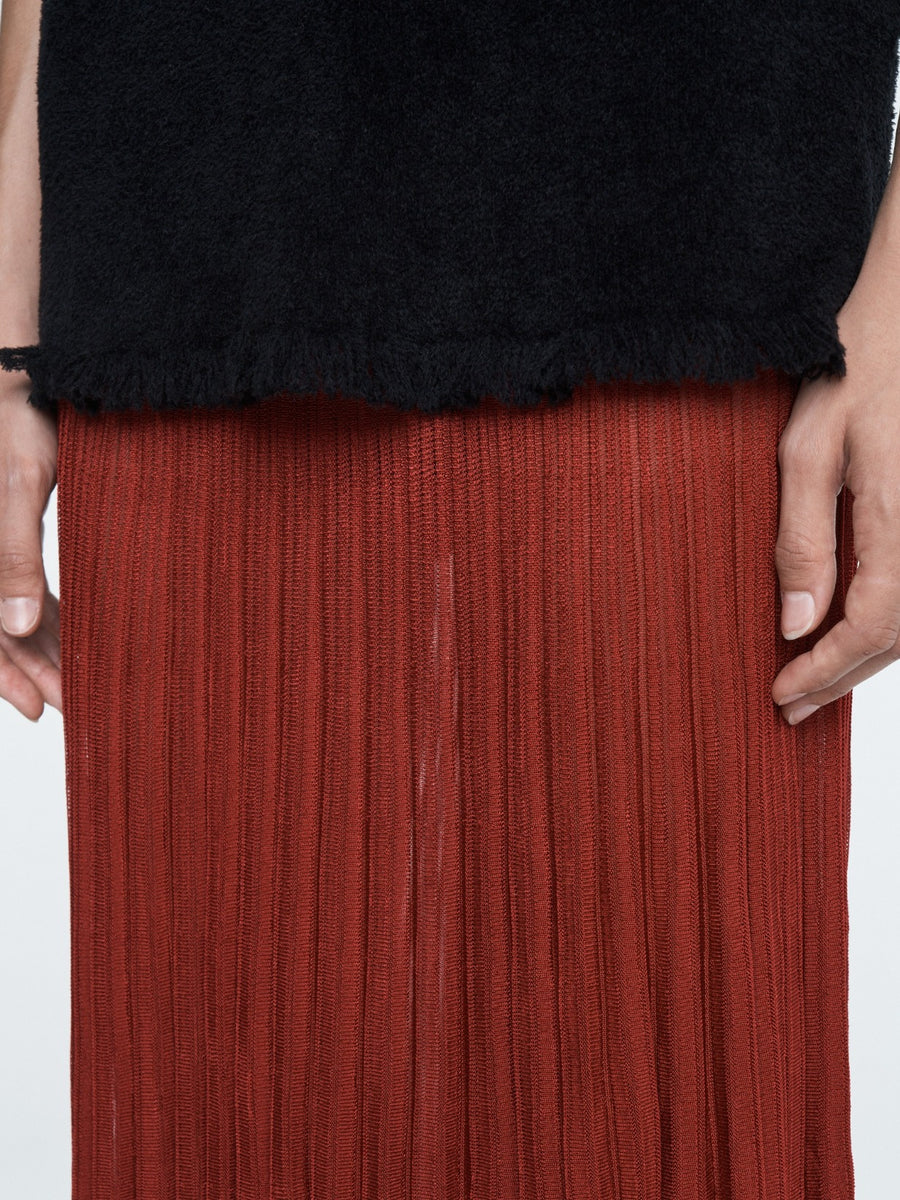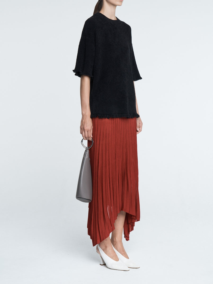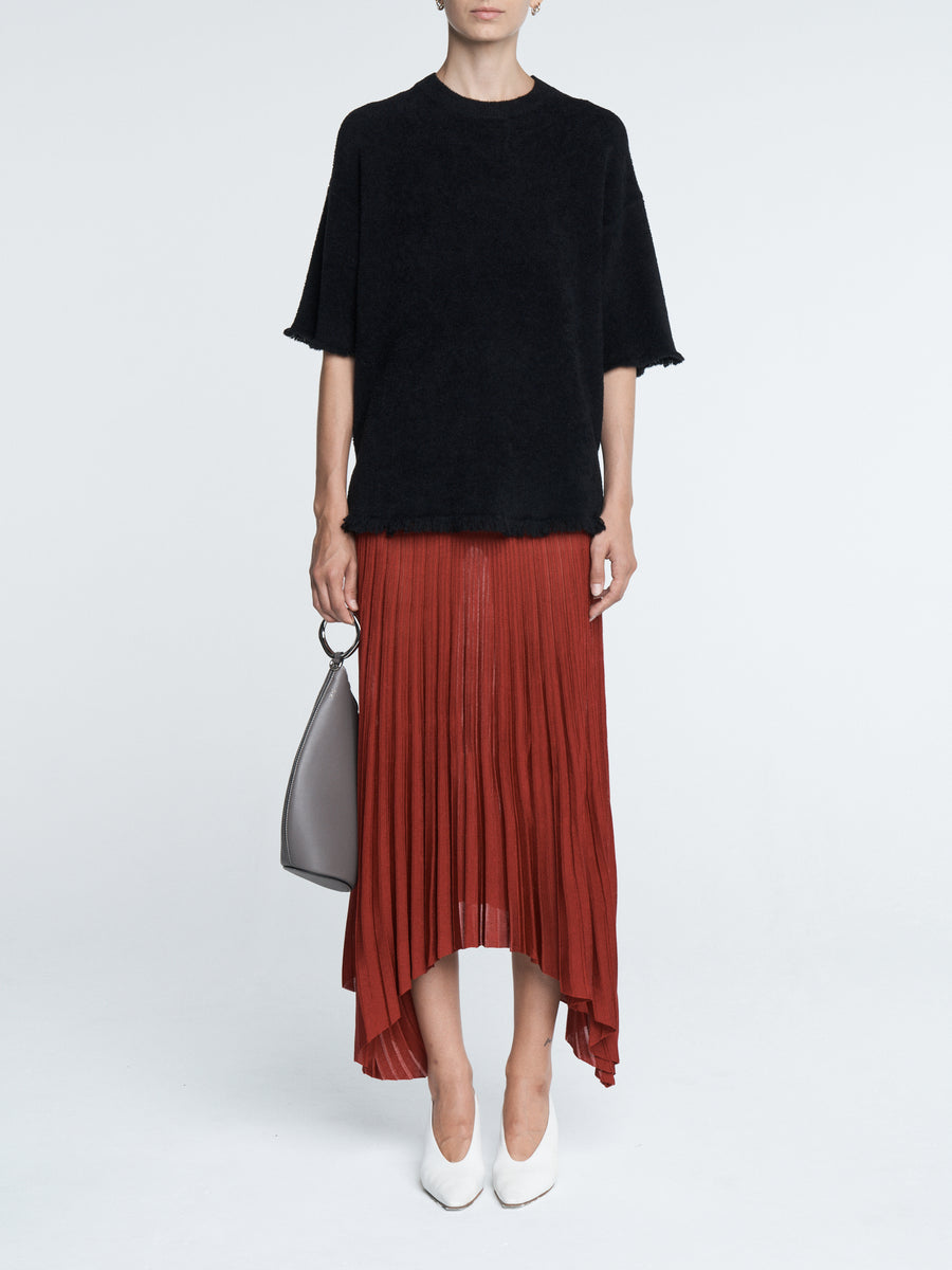The Fray T is knit in the softest, organic cotton velour in black. It has a relaxed fit, drop shoulder, longer length and frayed edges at the shoulder and bottom hem. Pairs perfectly with the Sheer Pleat Skirt in powder pink or black.