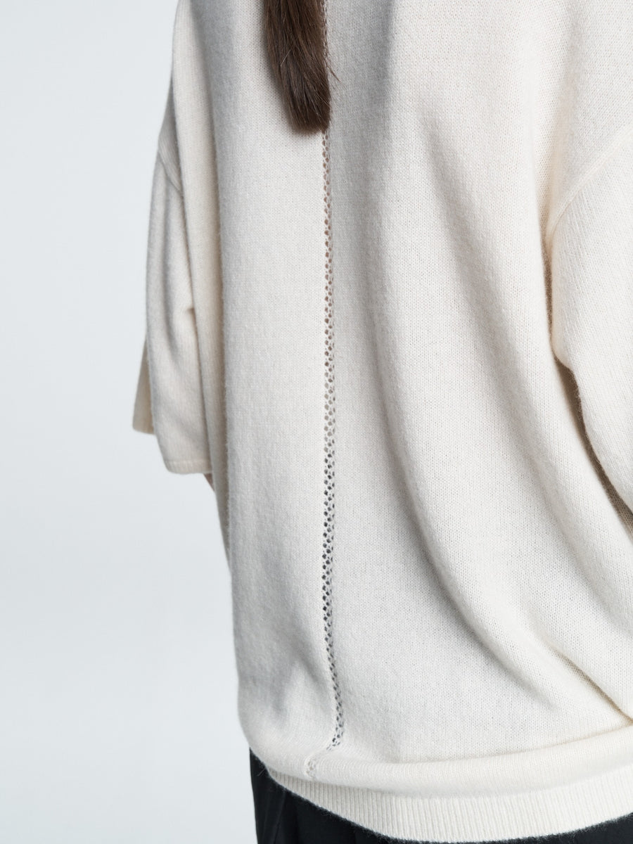 Knit from a luxe Italian recycled cashmere and organic cotton blend, the Drop Shoulder T-shirt in ivory has a relaxed, oversized fit and a beautiful lingerie stitch detail down the center back.