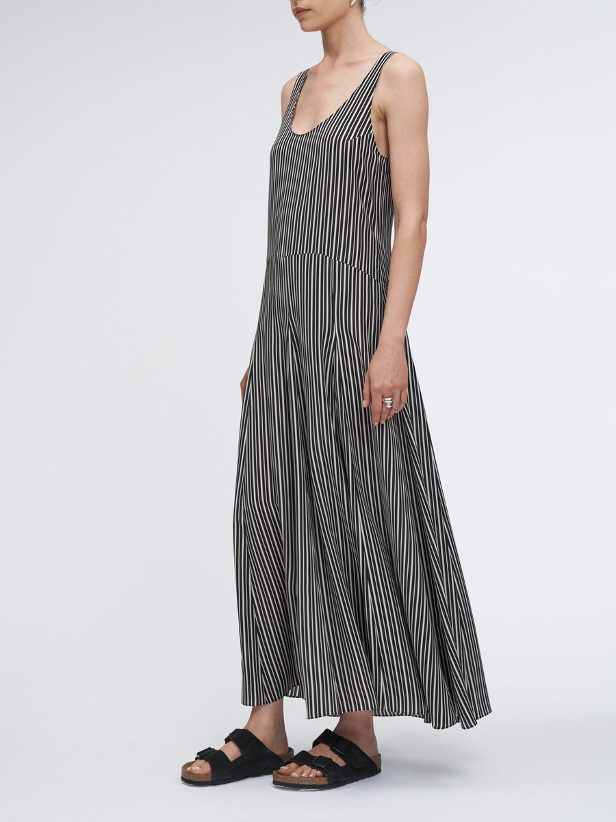 Developed in our silky cotton cupro with vintage inspired awning stripe, this ankle-length dress features a godet skirt for graceful movement as you walk. The scoop detailing at the front and lower back neck add to the effortless elegance of this piece.