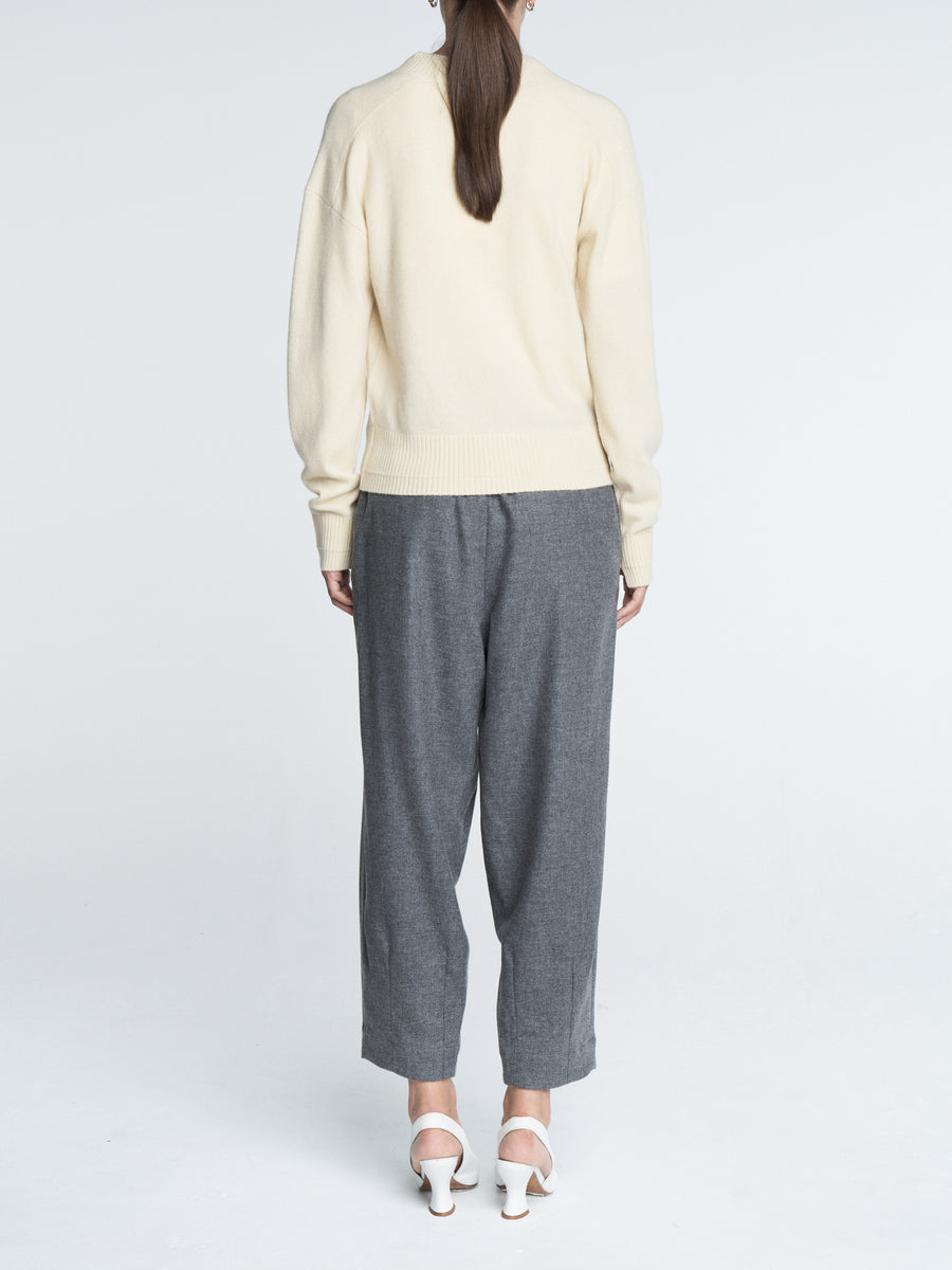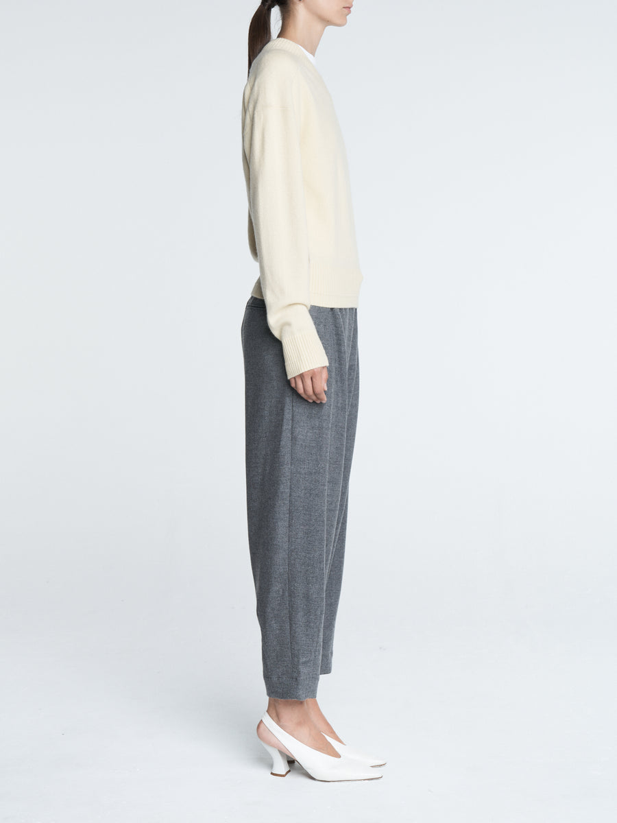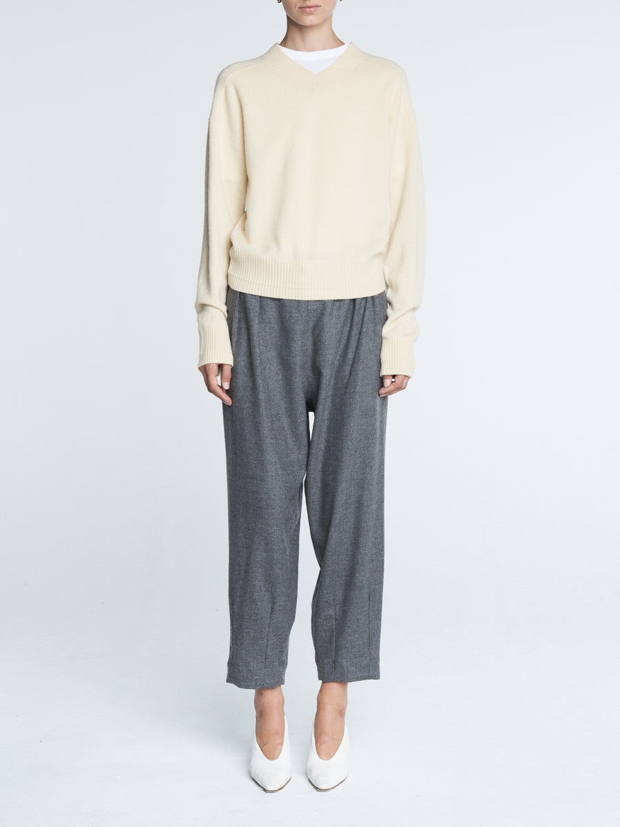 The Primrose Yellow High V-neck Sweater is made in a beautifully soft cashmere-wool blend. It is designed with a structured shoulder, high v-neckline, and a boxy, cropped fit. Looks perfect layered over our Baby Tee or on its own.