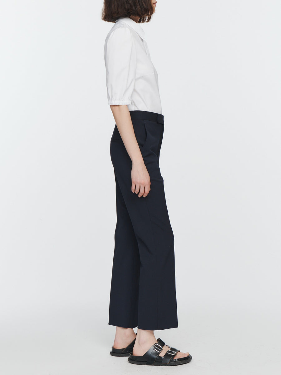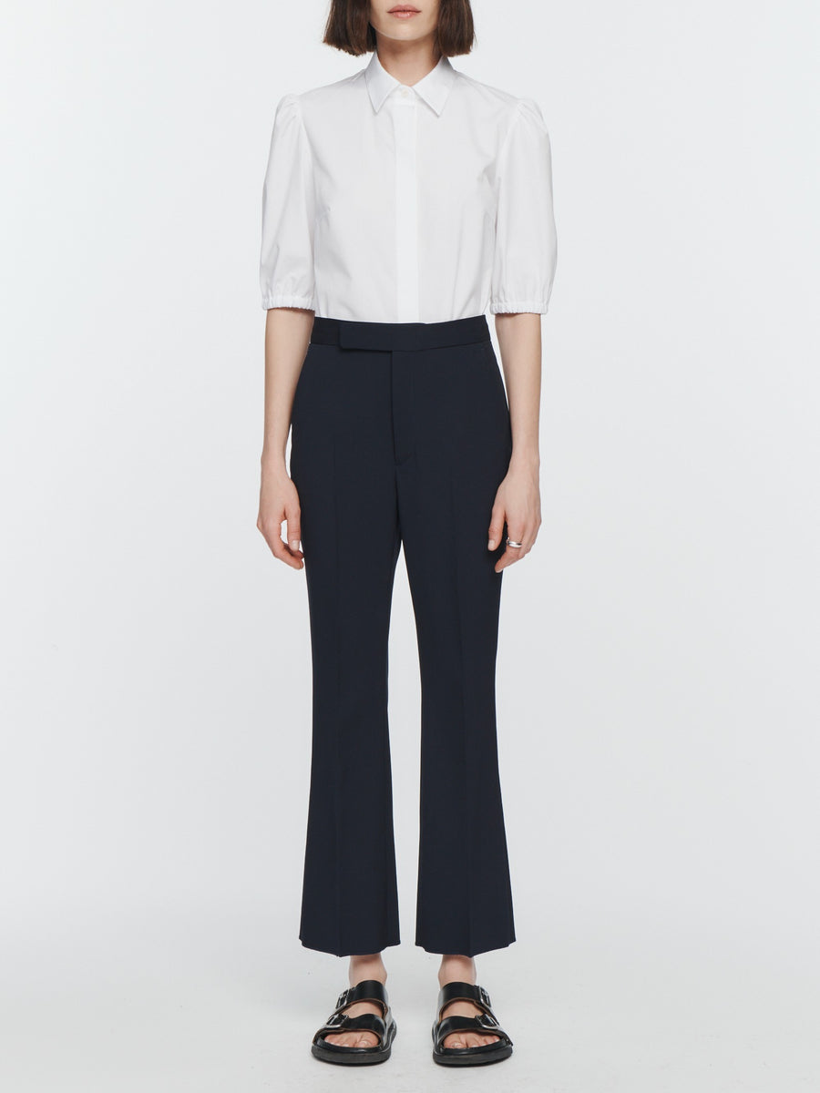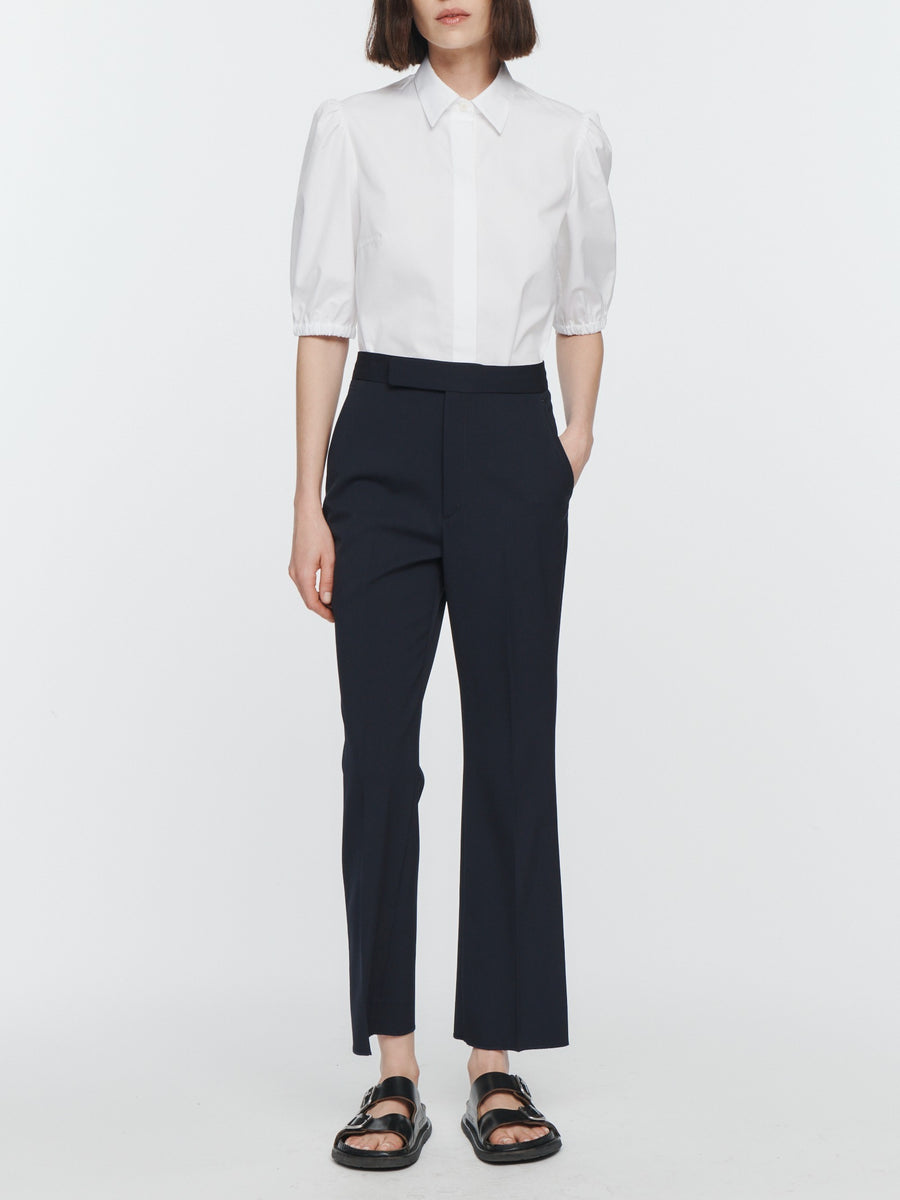 Our Signature High Waisted Crop Trouser is made in super stretch Italian wool certified by the Responsible Wool Standard (RWS) for an incredibly comfortable, flattering fit. Featuring a high waist, slash pockets and a slight flare at the bottom of the leg.