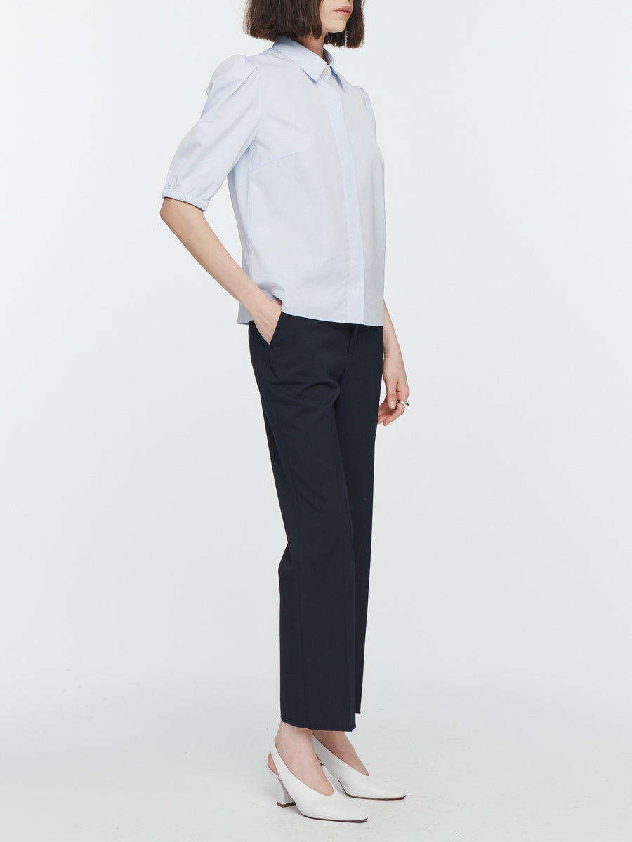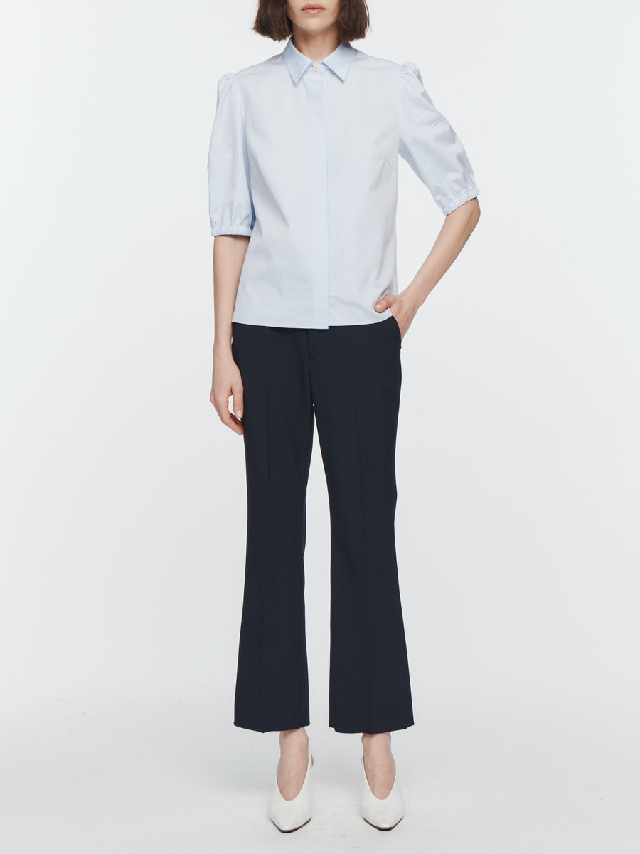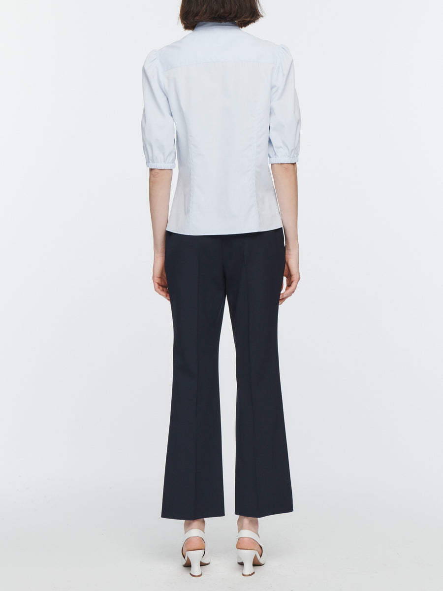 Our Signature High Waisted Crop Trouser is made in super stretch Italian wool certified by the Responsible Wool Standard (RWS) for an incredibly comfortable, flattering fit. Featuring a high waist, slash pockets and a slight flare at the bottom of the leg.