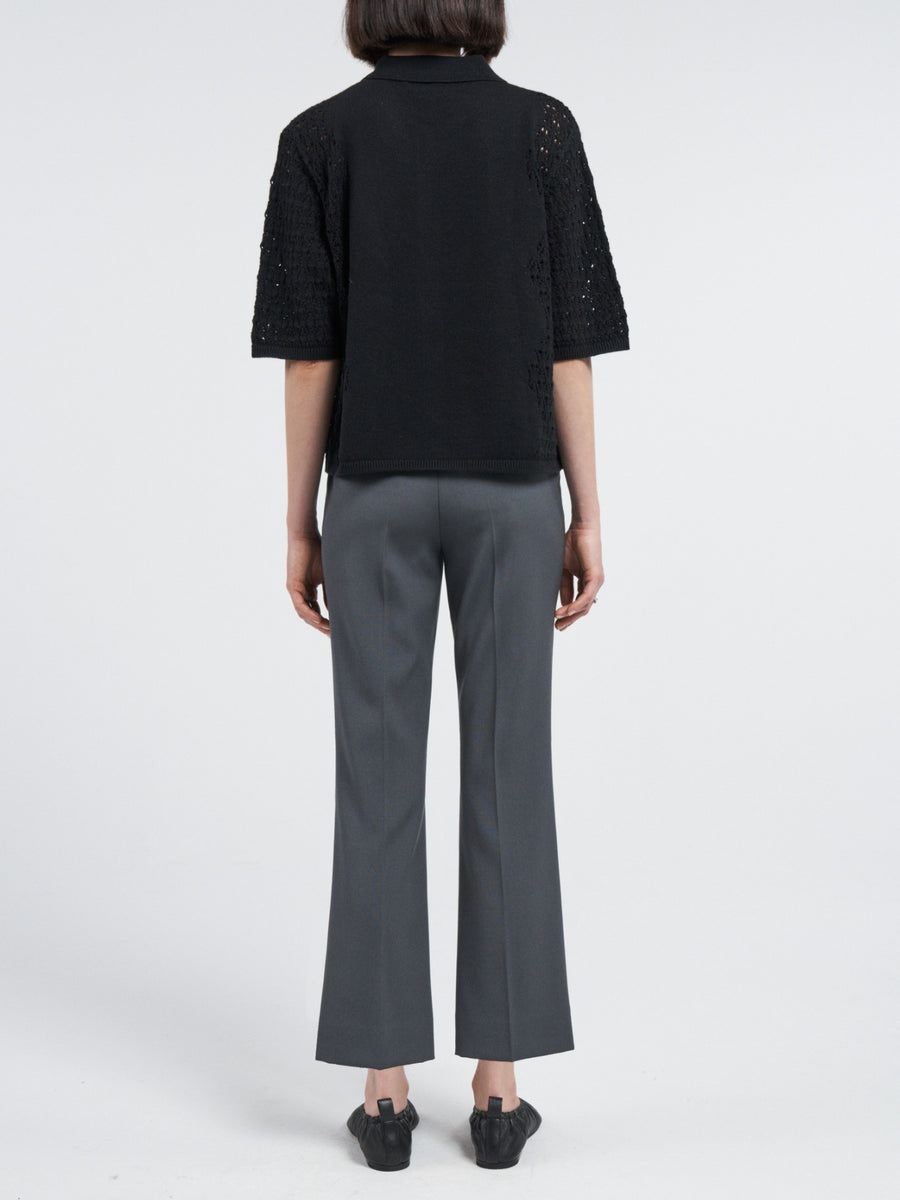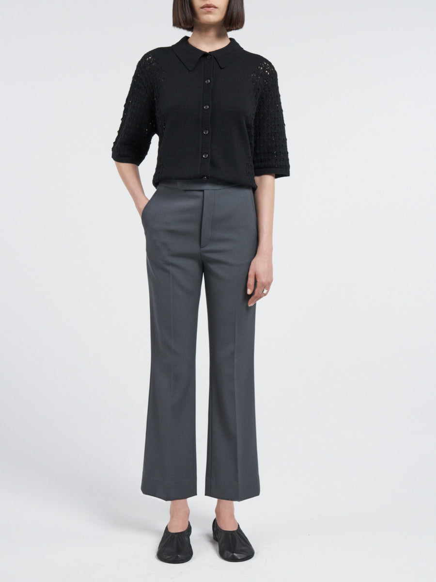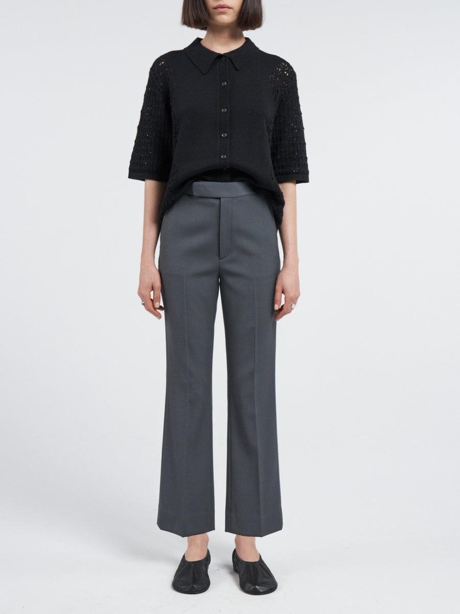 Rendered in a Steele Grey, this trouser is expertly tailored from super-stretch Italian responsible wool in a refined basketweave. Designed with a high waist, slash pockets, and a subtle flare at the hem, it offers a sleek and flattering fit.