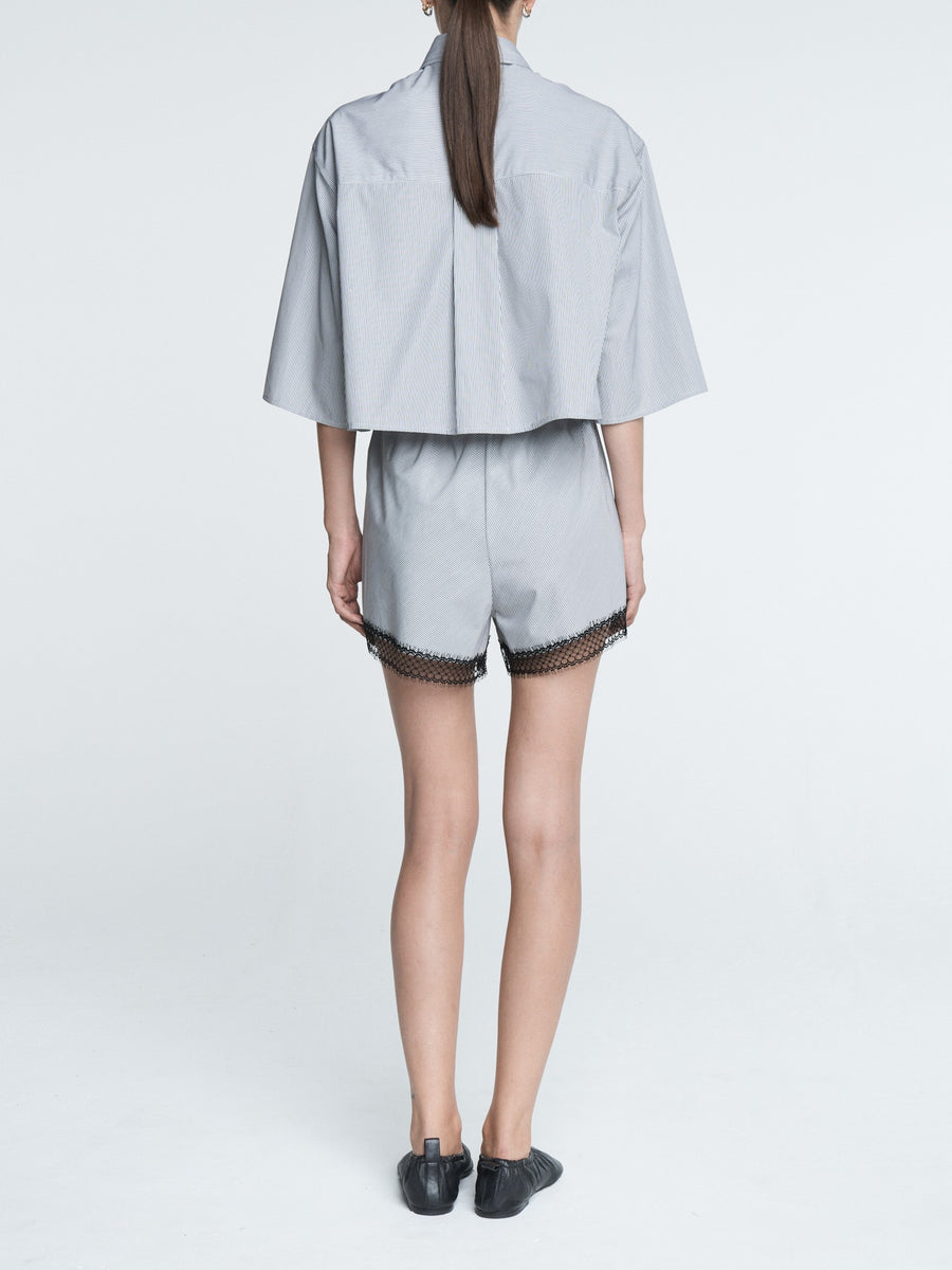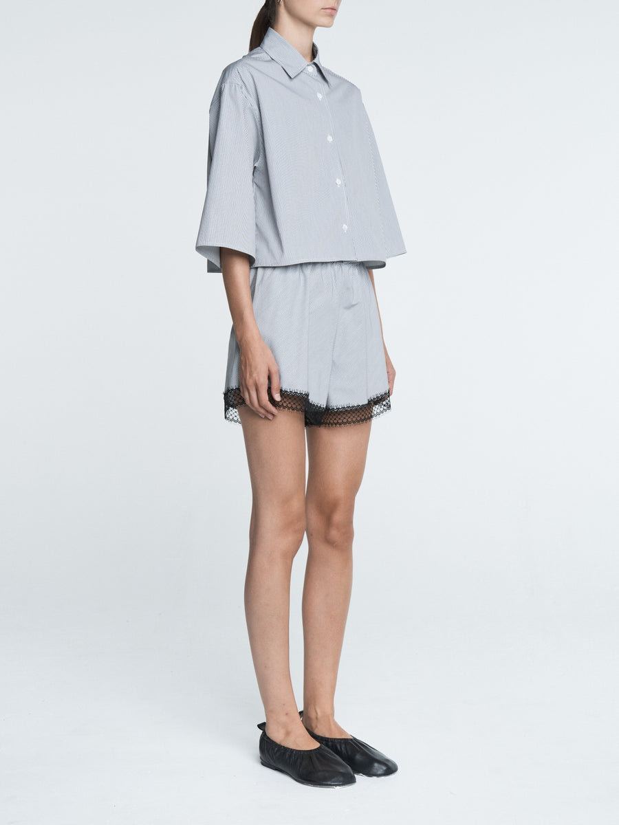 The Lace Bias Short in pinstripe black and white is made of GOTS certified Organic cotton and finished with a delicate French black lace. Wear with our matching Cropped Short Sleeve Shirt, a cashmere cardigan or over a bathing suit.