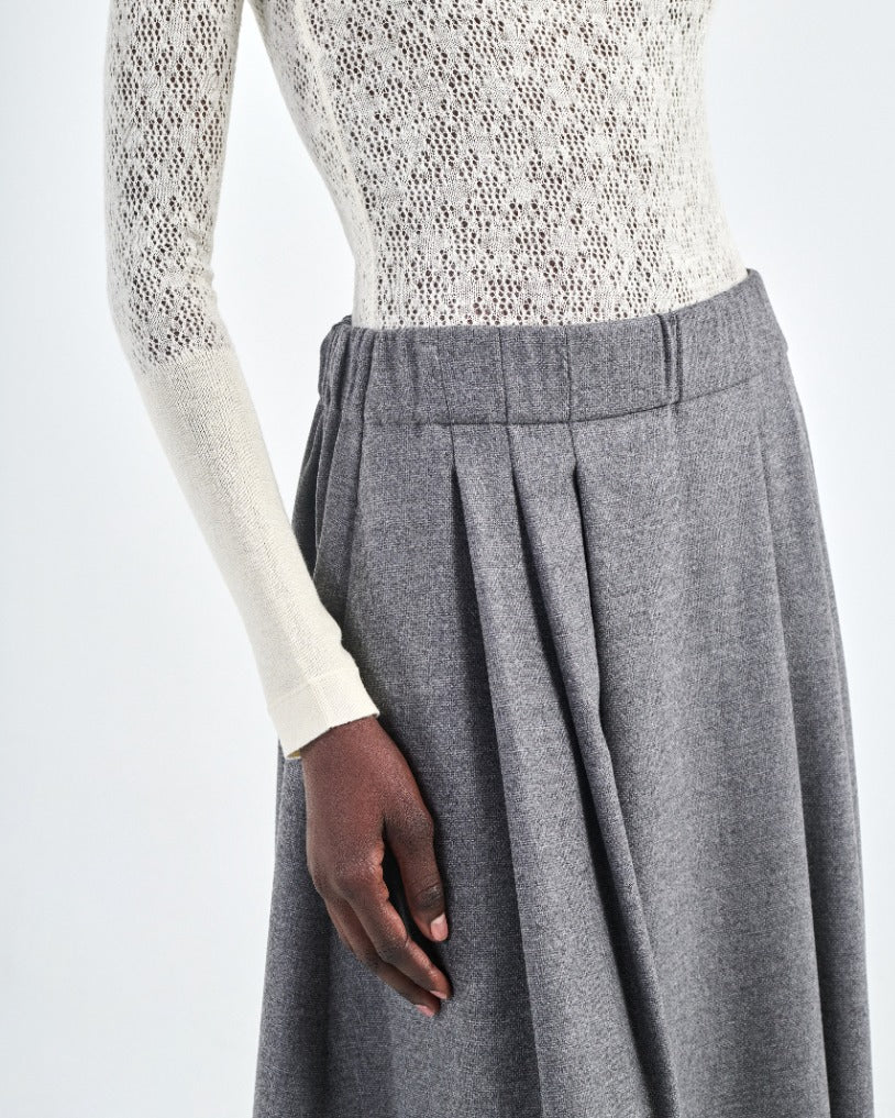 The Pleat Front Full Skirt is made in a beautifully textured, Italian charcoal wool tweed. This midi-length skirt has a very comfortable elastic waistband, pleat details at the front, and two side pockets.