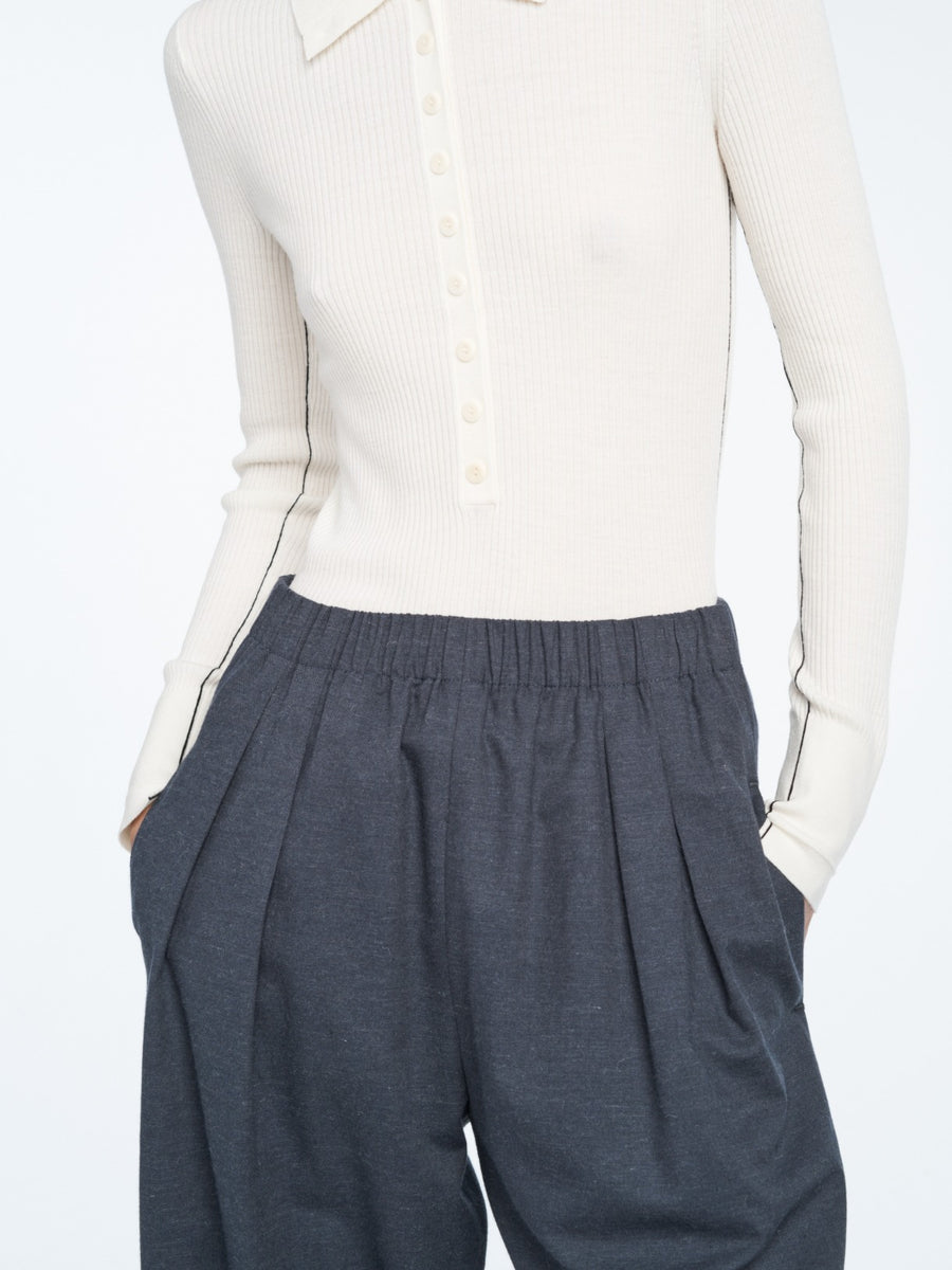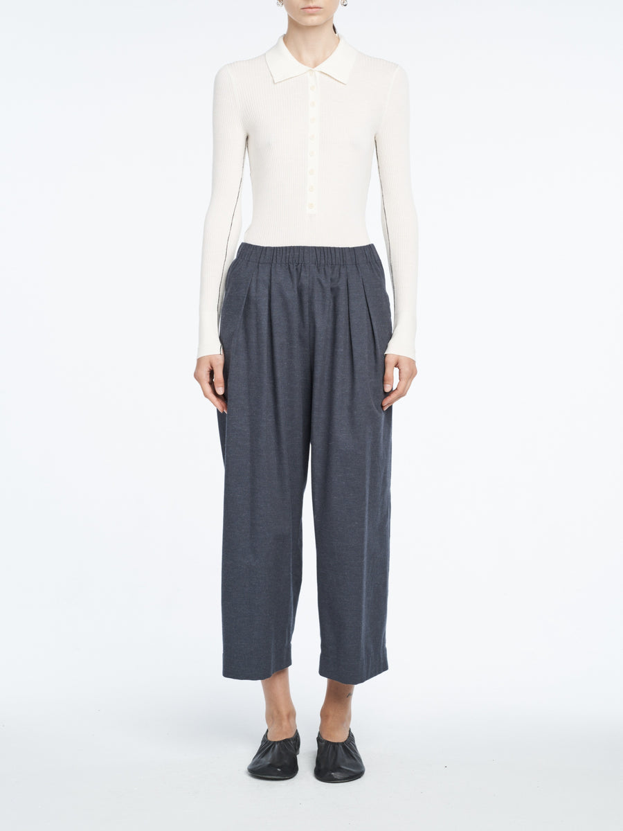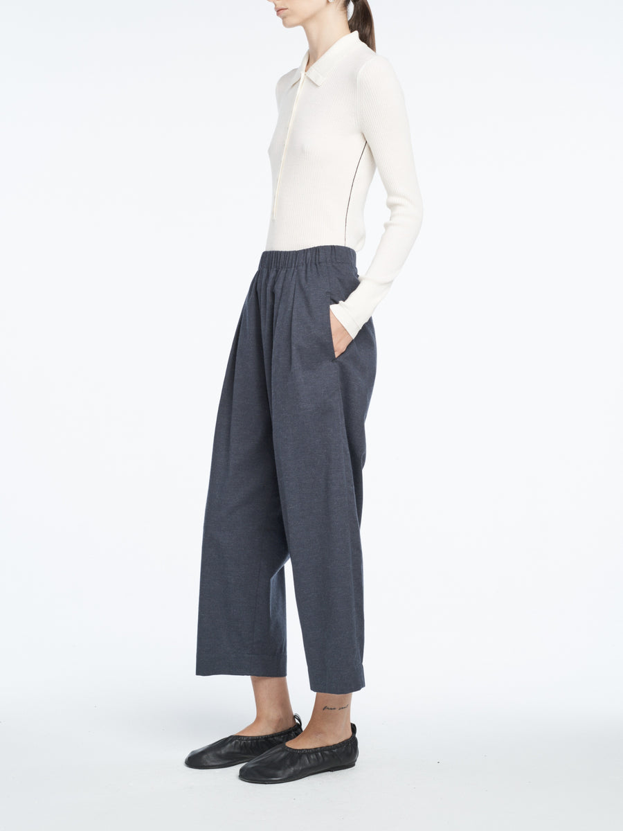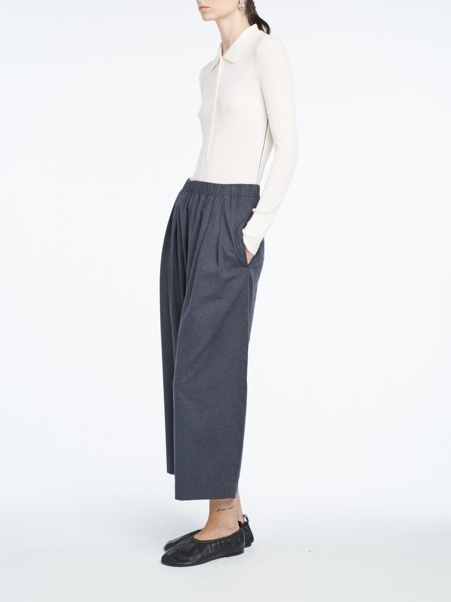 Our Pull On Wide Leg Crop is a new style and easy addition to the everyday wardrobe. Made in a brushed navy cotton flannel blend, the trousers have and elasticated waistband, a wide leg shape cropped at the ankle, feature hidden pockets.