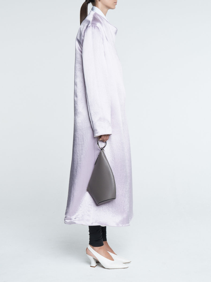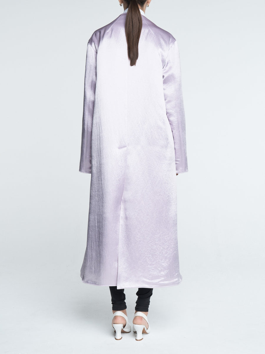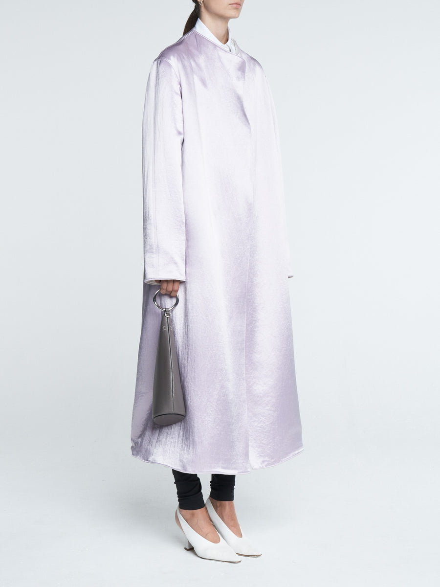 The Duster Coat is made from a lustrous Japanese Naia Renew Sateen and is completely reversible from powder pink to champagne. Slightly oversized and midi length, the perfect piece to complete an evening look or make a pair of jeans and white t-shirt special.