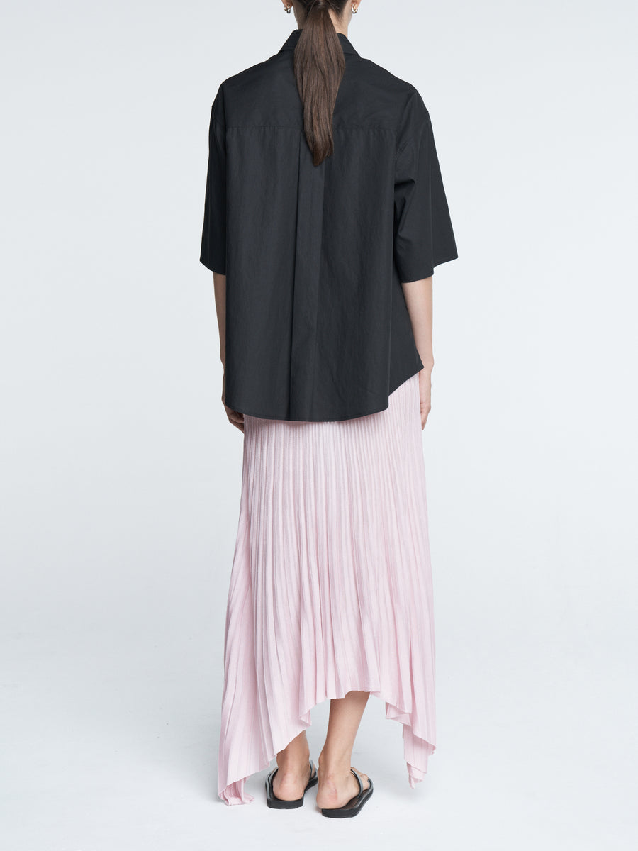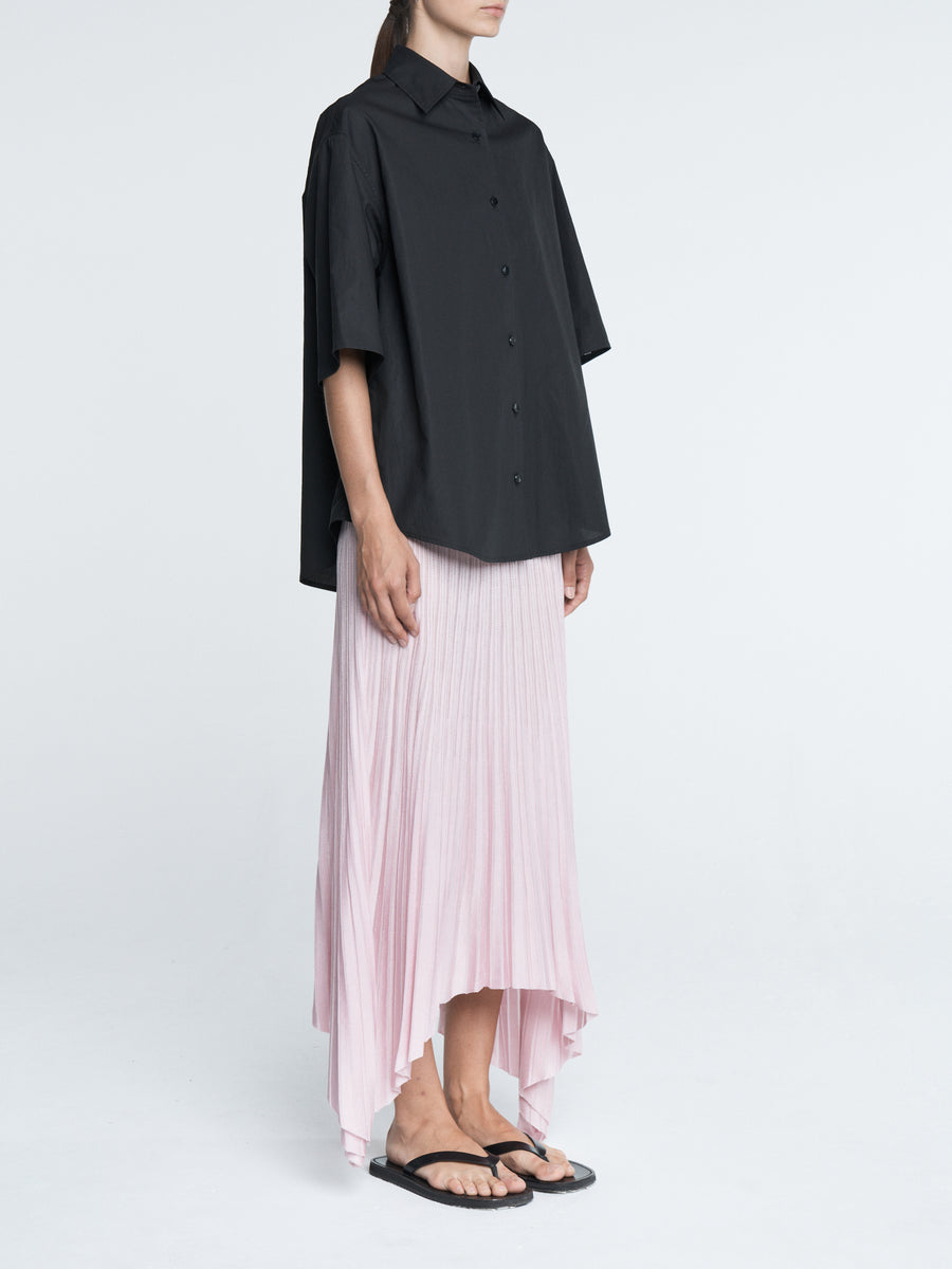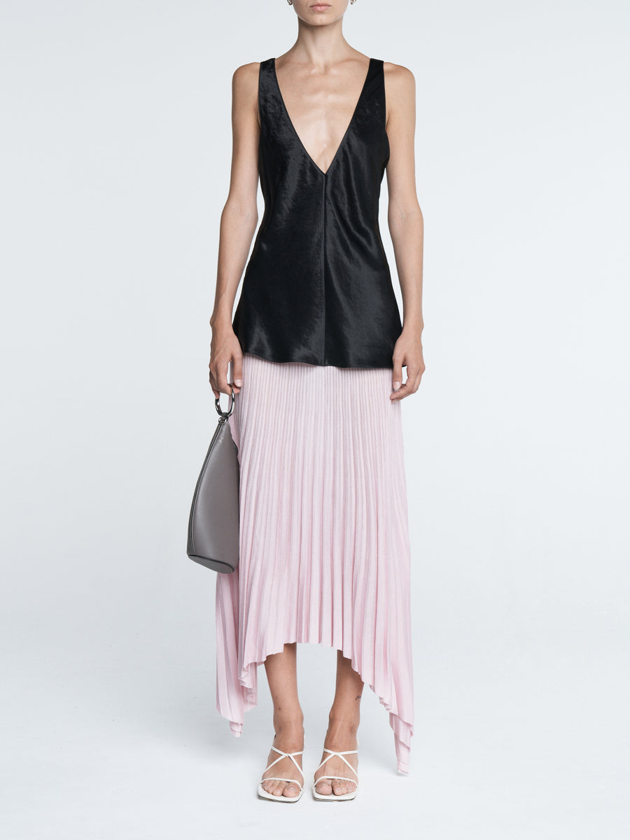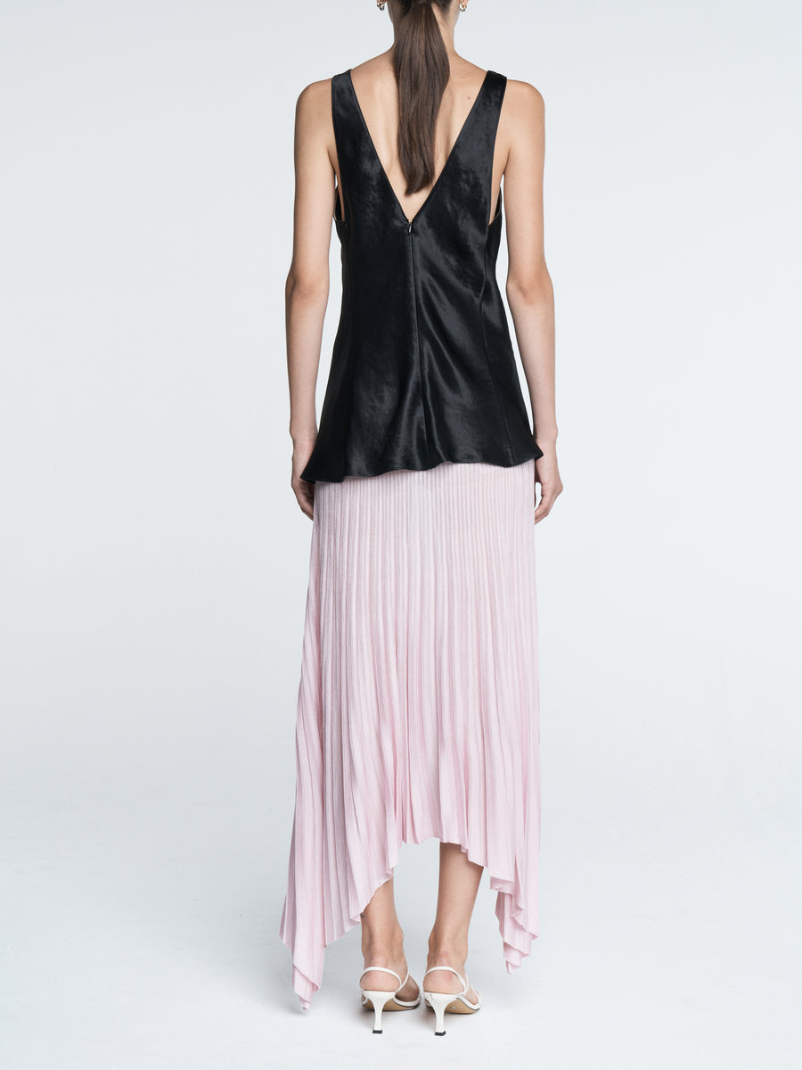 The Sheer Pleat Skirt in powder pink is knit in an FSC viscose with a flowy, midi length, pleated, sheer skirt, fitted stretch waistband and shorter lining to highlight the sheerness of the skirt.