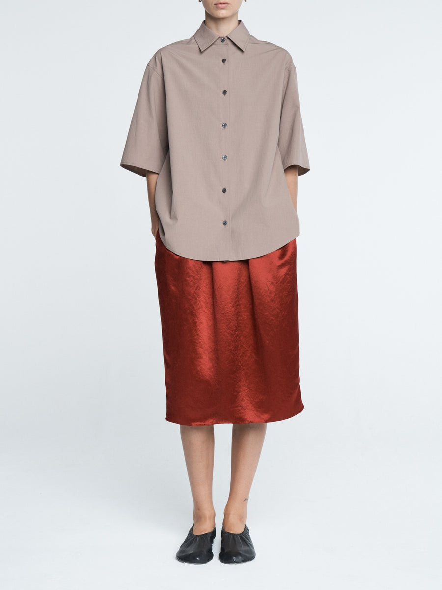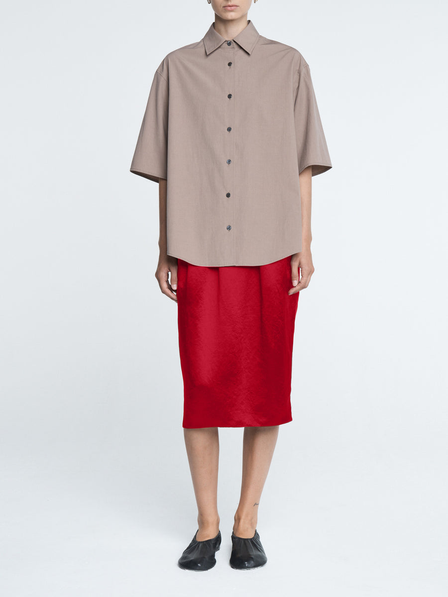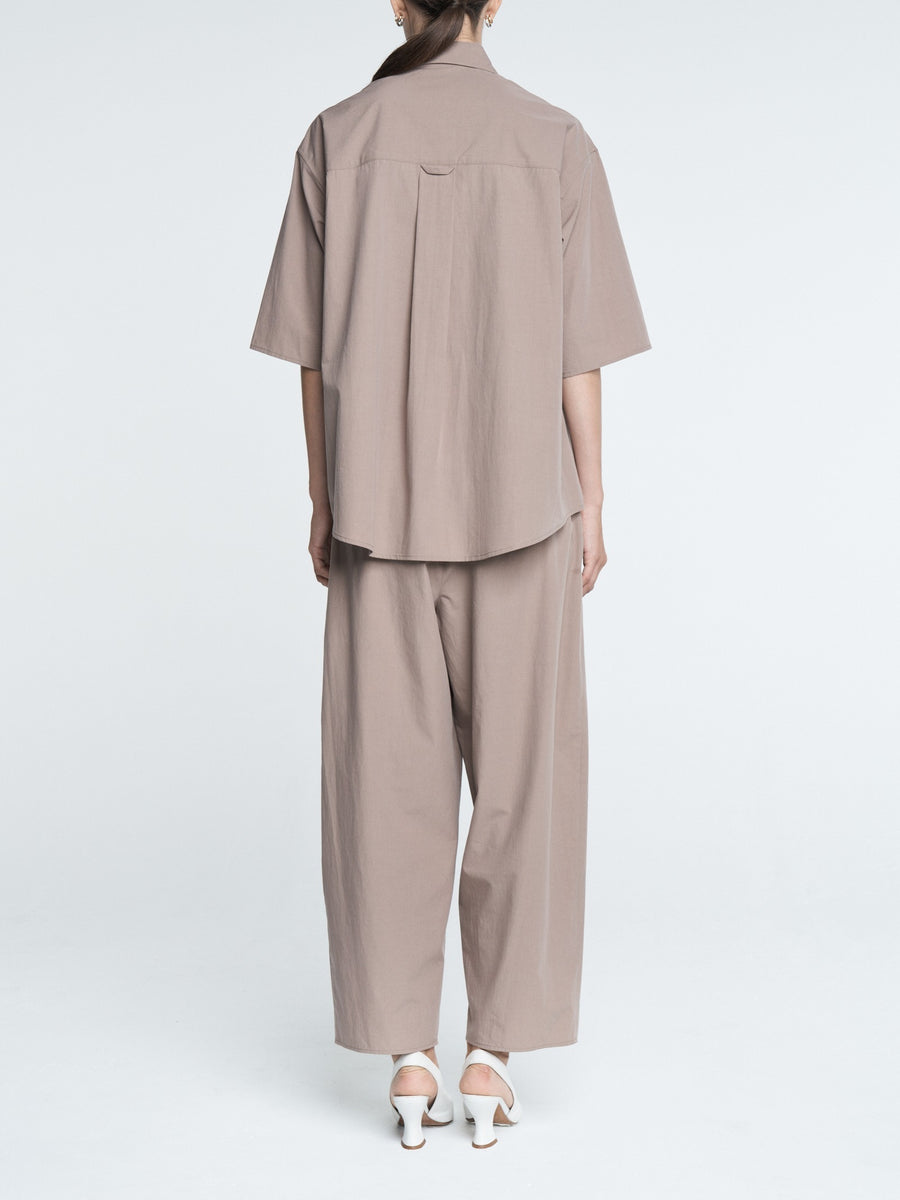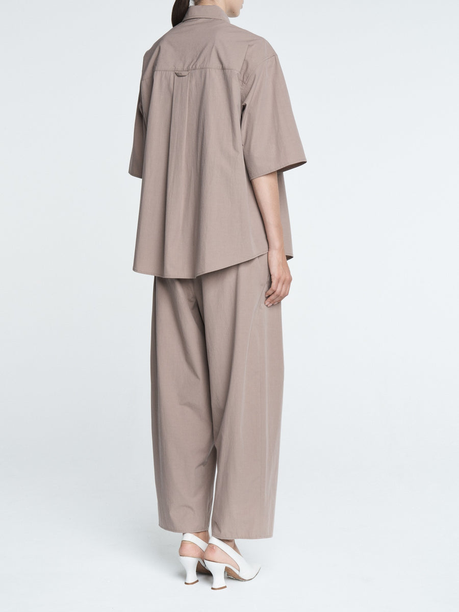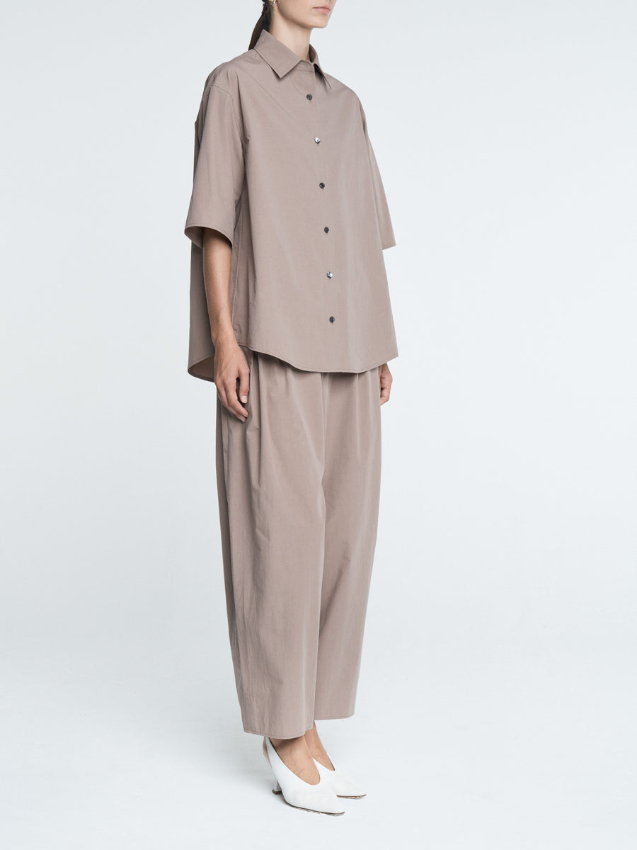 The Short Sleeve Tunic Shirt in grey mouseback GOTS certified organic cotton has a relaxed fit, longer tunic length, center back box pleat and wide, short sleeves. It is finished with biodegradable, corozo buttons and a tonal MM monogram. Pairs perfectly with our matching Drawstring Trouser.